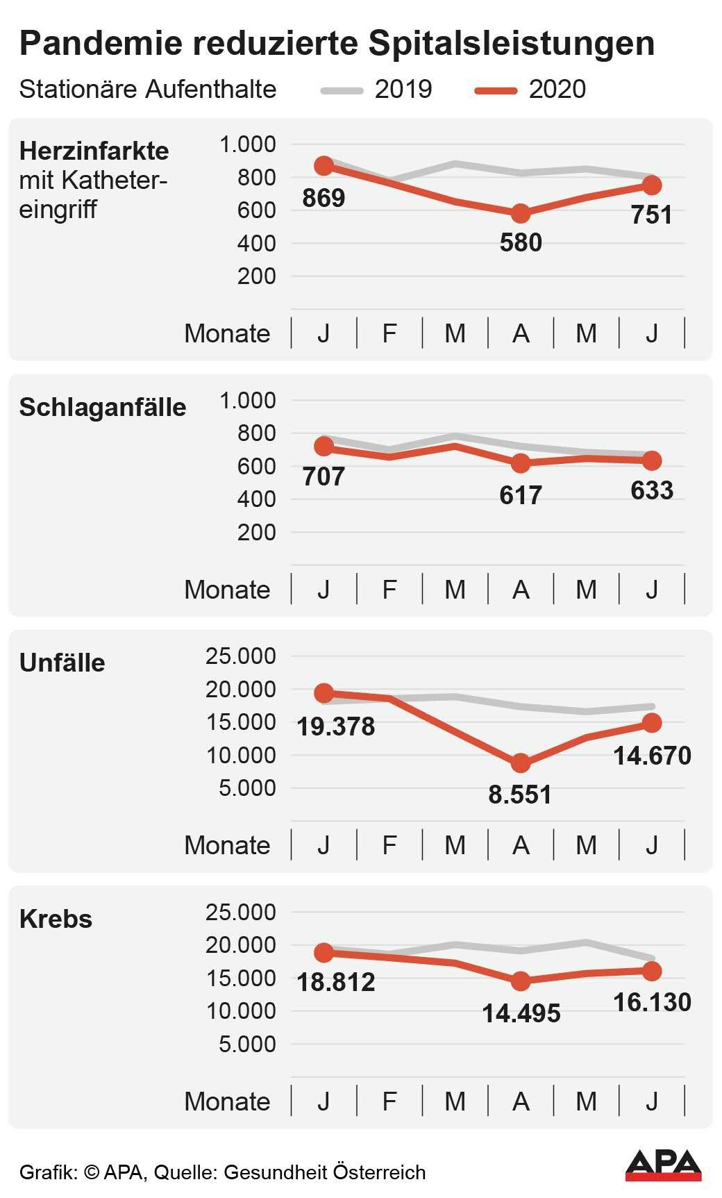 Karin Eglau von der Gesundheit Österreich GmbH (GÖG) hat im Auftrag des Ministeriums die Informationen aus dem stationären Bereich der Krankenanstalten in den vergangenen Monaten analysiert: "Bei den Herzinfarkten mit interventionellen Eingriffen gab es von März bis Mai eine Reduktion der stationären Aufenthalte um 25 Prozent." Aus anderen Ländern seien Reduktionen um bis zu 40 Prozent berichtet worden.