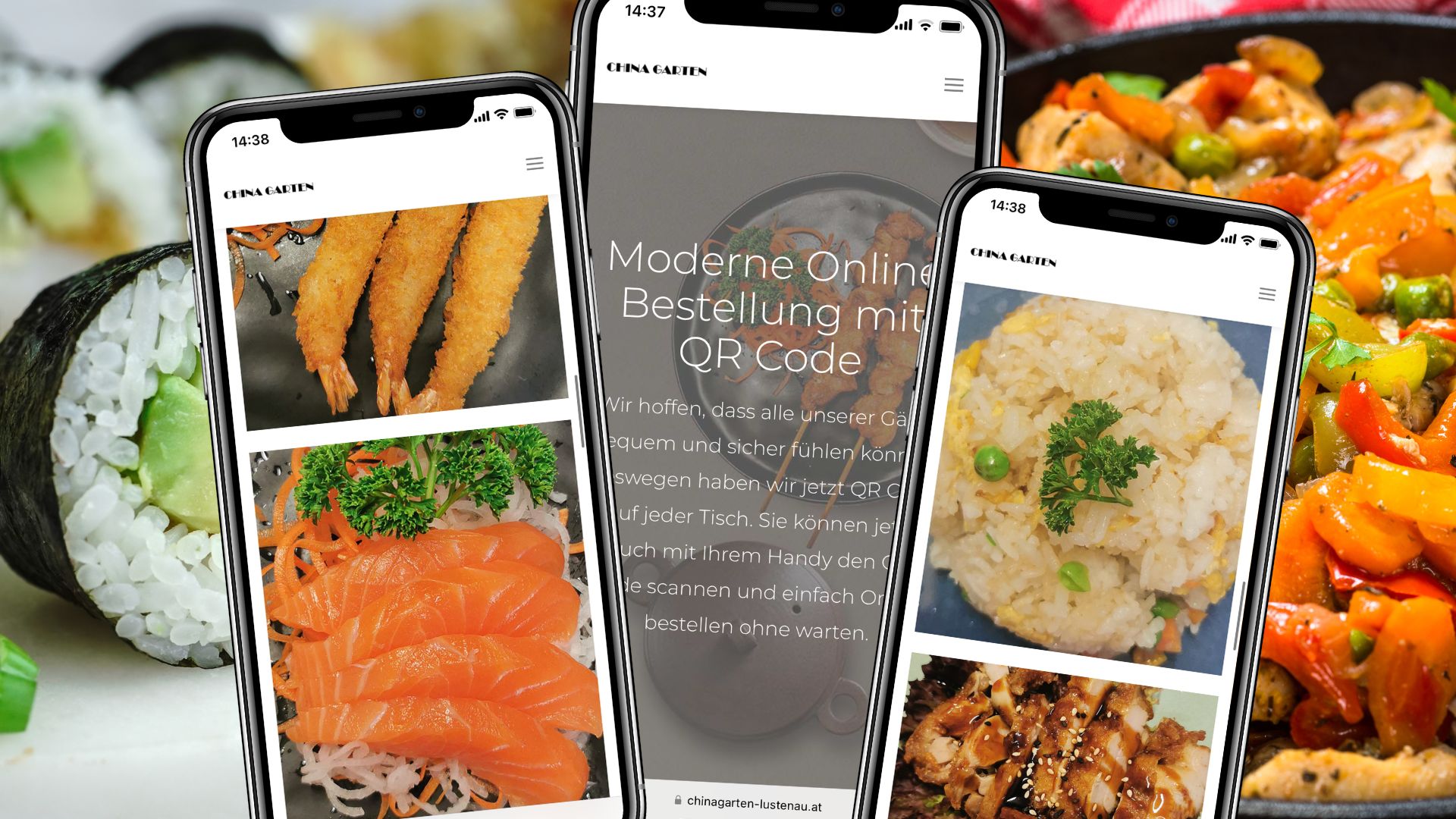 Von Sushi und Suppen über knusprige Ente bis hin zu vegetarischen Speisen finden hier alle das Passende. ©Screenshots CHINA GARTEN (www.chinagarten-lustenau.at)/Canva (Symbolbilder)