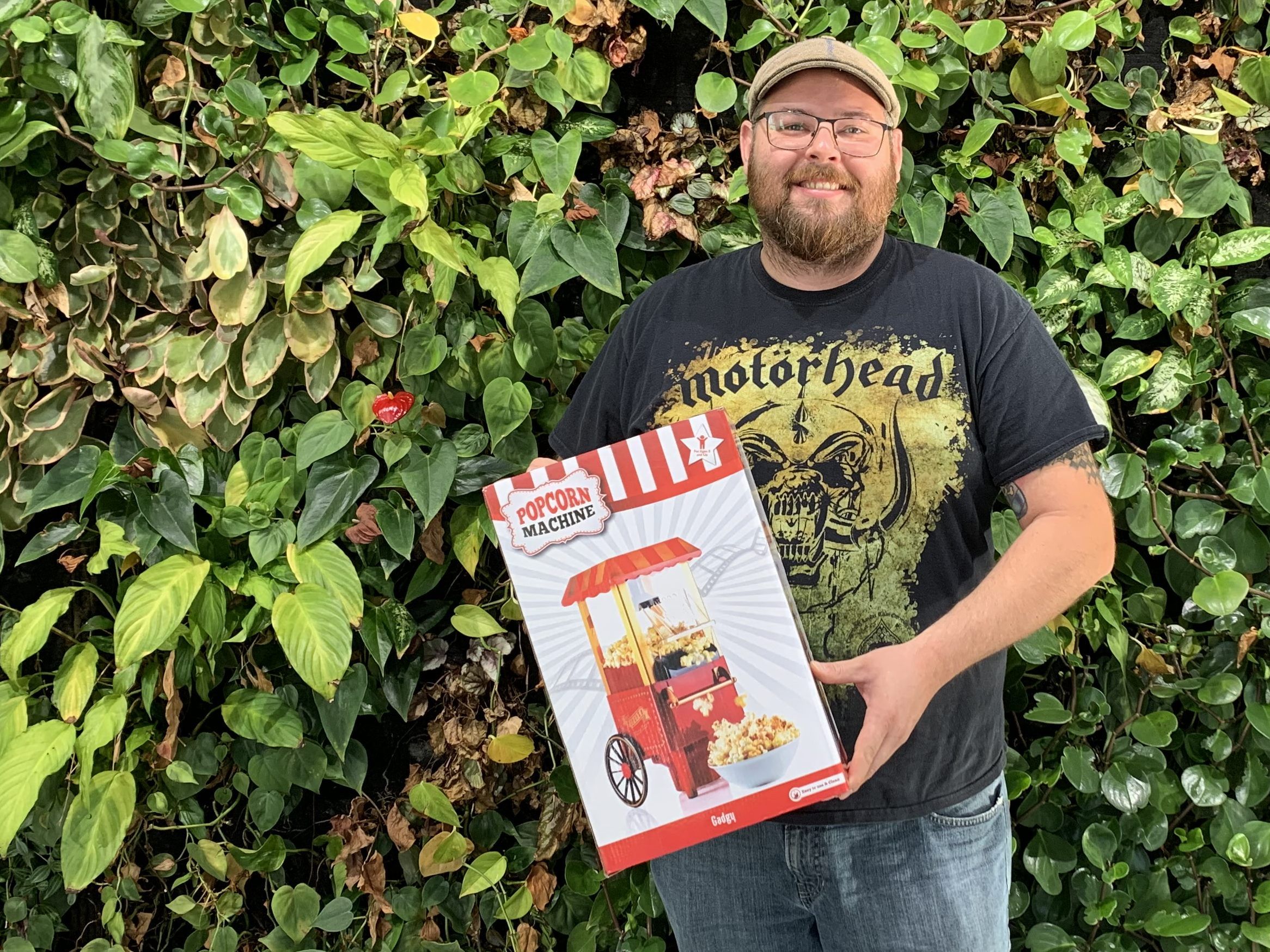 Manuel kann sich schon auf einen Filmabend freuen - er hat eine retro Popcornmaschine abgestaubt!