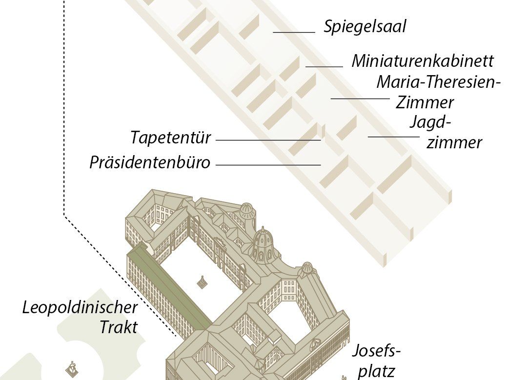 Der Weg zum Bundespräsidenten führt vom Eingang am Ballhausplatz die Adlerstiege hinauf, über den roten Teppich durch eine imperial anmutende Zimmerflucht, die Appartements Maria Theresias: Das Erste und Zweite Bellariazimmer, das Rosenzimmer, das Pietra-Dura-Zimmer, den Spiegelsaal und schließlich das Miniaturenkabinett in das Maria-Theresien-Zimmer. Den Weg säumt wertvolles Kunsthandwerk: Etwa die “kaiserliche Vorstellungsuhr”, ein Geschenk an Maria Theresia zum zehnjährigen Regierungsjubiläum, eine große Sammlung an “pietra dura”-Arbeiten – Bilder aus hauchdünnen Steinplättchen – oder eine astronomischen Standuhr, deren Zeiger gegen den Uhrzeigersinn gehen, damit Maria Theresia vom Bett aus die Zeit über einen Spiegel richtig ablesen konnte.