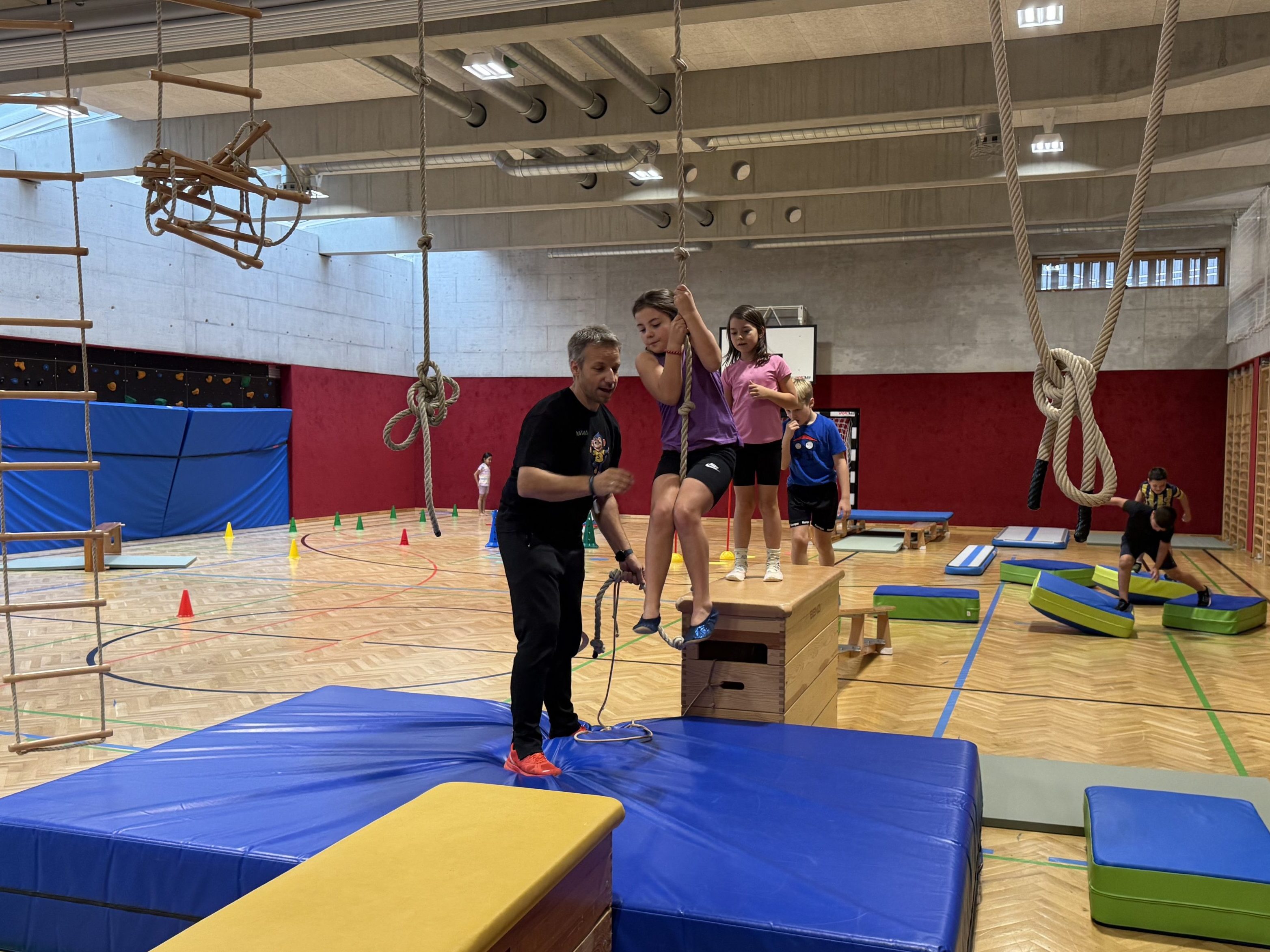 Wie? Indem er einen Bewegungsparcours baute, in dem die Kinder auf unterschiedliche Weise über eine große Matte schwingen mussten. Sinnbildlich für die vielen Lösungswege, die es im Leben gibt. Dabei wird nicht nur Mut gefordert, sondern auch Kreativität und gegenseitiger Respekt.