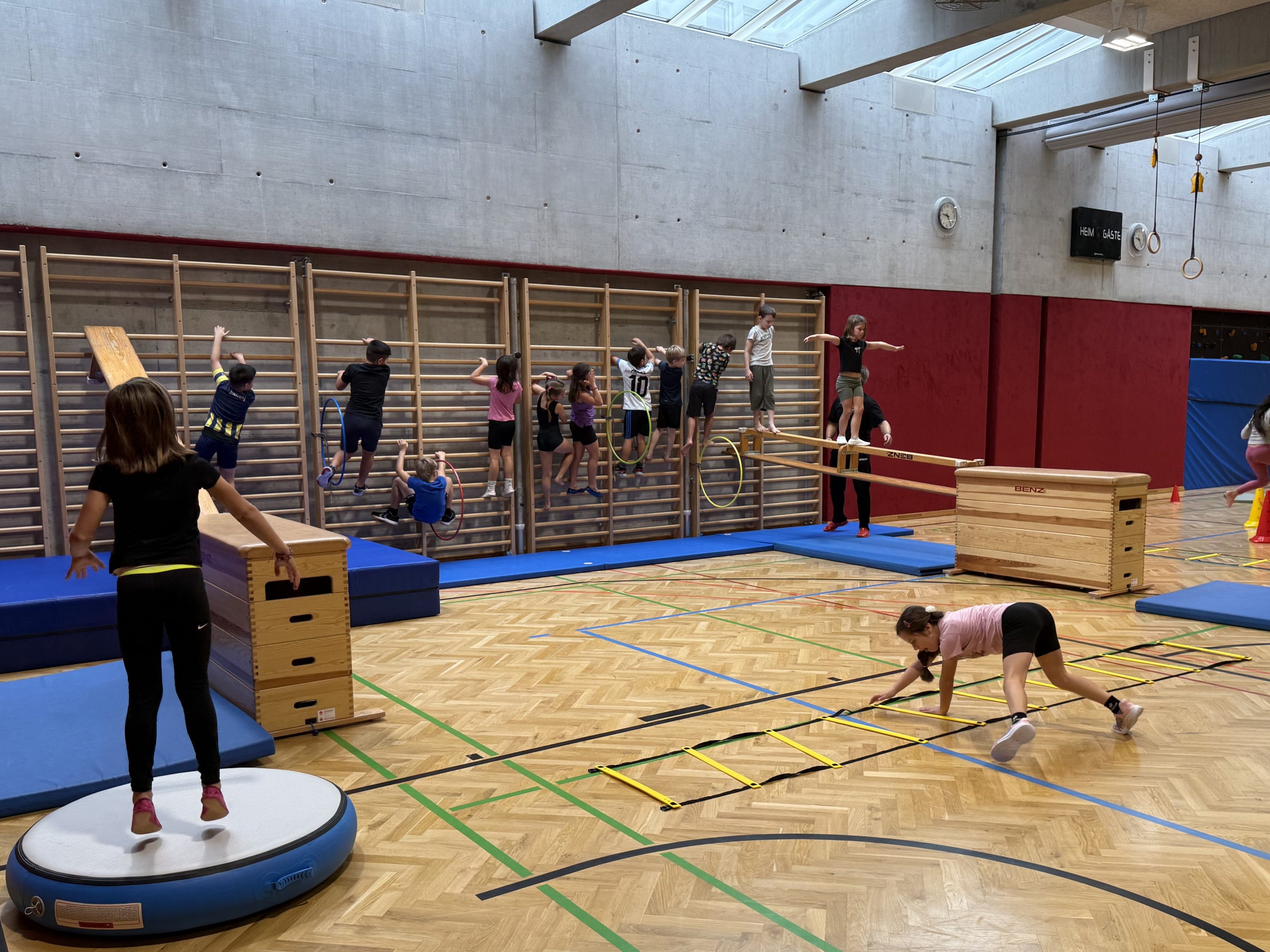 Im Zentrum des Projekts steht ein kleiner Affe namens Samy. Im gleichnamigen Buch erleben die Kinder gemeinsam mit ihm Abenteuer, die sie Woche für Woche vorbereitend im Unterricht lesen. Diese Woche ging es darum, wie Samy einen Fluss überqueren musste. Die Botschaft war: Viele Wege führen zum Ziel. Und genau das hat Mathias Mohr in der Turnhalle aufgegriffen.