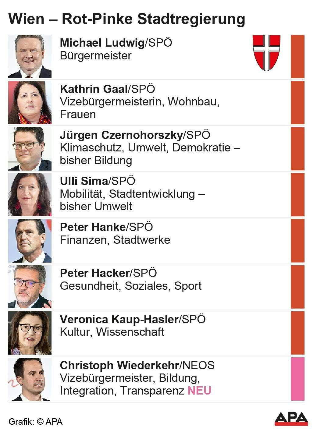 Darüber hinaus stellen die Sozialdemokraten mit Jürgen Czernohorszky, Kathrin Gaal, Peter Hacker, Peter Hanke, Veronica Kaup-Hasler und Ulli Sima sechs amtsführende Stadträtinnen und Stadträte. Die NEOS verfügen mit Christoph Wiederkehr über einen Ressortchef. Im Folgenden die Regierungsmitglieder im Kurzporträt: