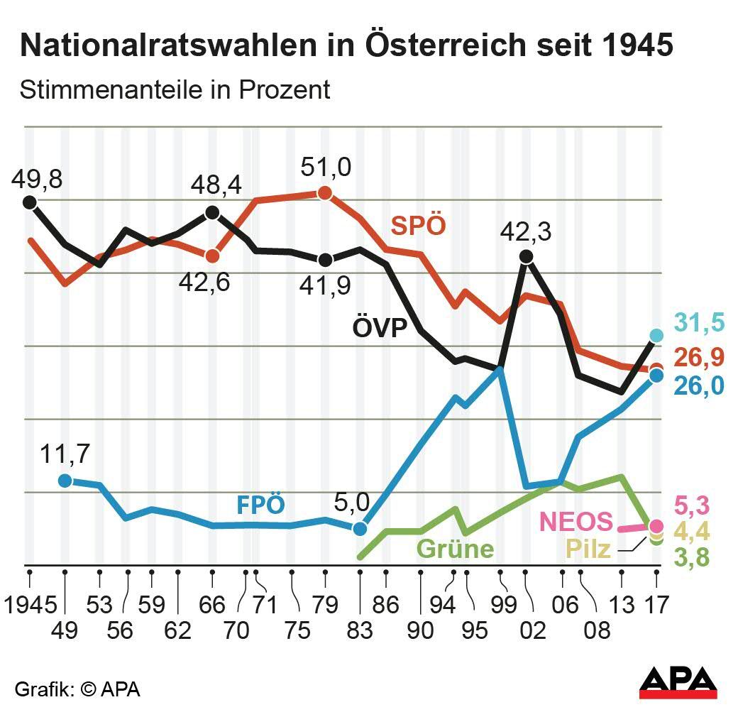 Parteichefwechsel prägten die folgende Periode - und beendeten sie vorzeitig. Denn Sebastian Kurz wollte die Koalition mit der (mittlerweile von Christian Kern geführten) SPÖ nicht mehr fortsetzen, als er im Mai 2017 den erst im August 2014 angetretenen Reinhold Mitterlehner ablöste. Also wurde nach vier Jahren gewählt. Die ÖVP - von Kurz von Schwarz auf Türkis umgefärbt - ging als strahlender Sieger durchs Ziel: Sie legte um 7,5 Punkte auf 31,5 Prozent zu und ließ die SPÖ (26,9 Prozent) weit hinter sich. Dank auch deutlichem FPÖ-Plus reichte es locker für Türkis-Blau, Kurz wurde Kanzler und Heinz-Christian Strache Vizekanzler. Die Grünen schauten aus der zweiten Reihe zu: Sie flogen bei der Wahl nach groben Querelen nach 31 Jahren raus. Statt ihnen zog die von Peter Pilz nach enttäuschender Kandidatenkür abgespaltete Liste JETZT ein. Die NEOS hielten sich in ihrer zweiten Wahl mit Parteigründer Matthias Strolz im Nationalrat, das Team Stronach hatte sich schon vor der Wahl aufgelöst. Die Wahlbeteiligung erholte sich auf genau 80 Prozent.