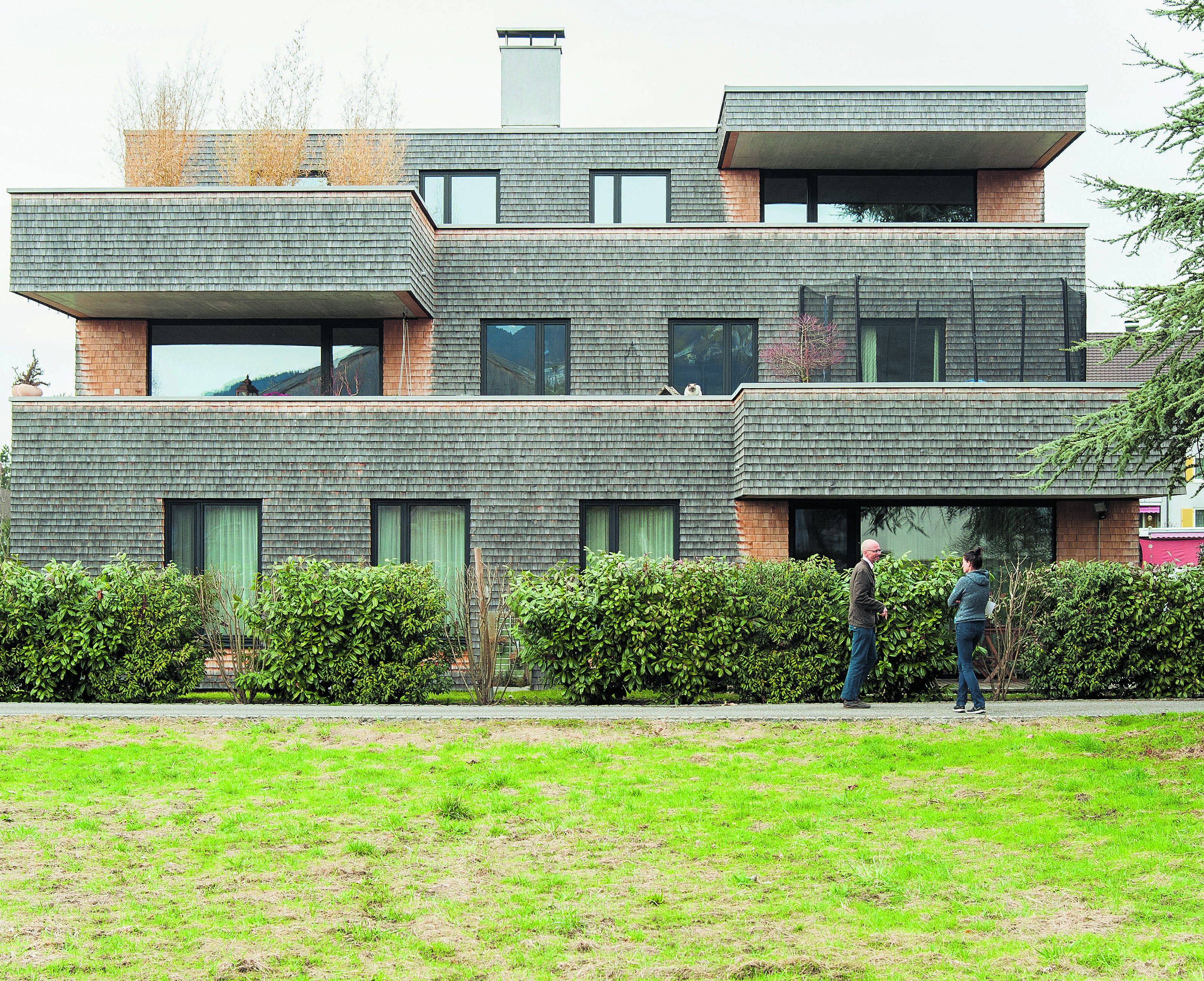 Die Siedlungslage entspricht der regional weit verbreiteten Struktur einer Einfamilienhauslandschaft. „Hier wollten wir eine Ergänzung anbieten, die sich aber gut integrieren kann.“ Größe, Gestaltung und Platzierung auf dem Grundstück tragen zu dieser Integration bei. Die Eigentümerin hatte das Grundstück vor wenigen Jahren erworben, danach begann die Planung. Von Beginn an war klar, dass hier nicht zum Eigenbedarf gebaut wird. Die Wohnungen sollten vermietet werden.