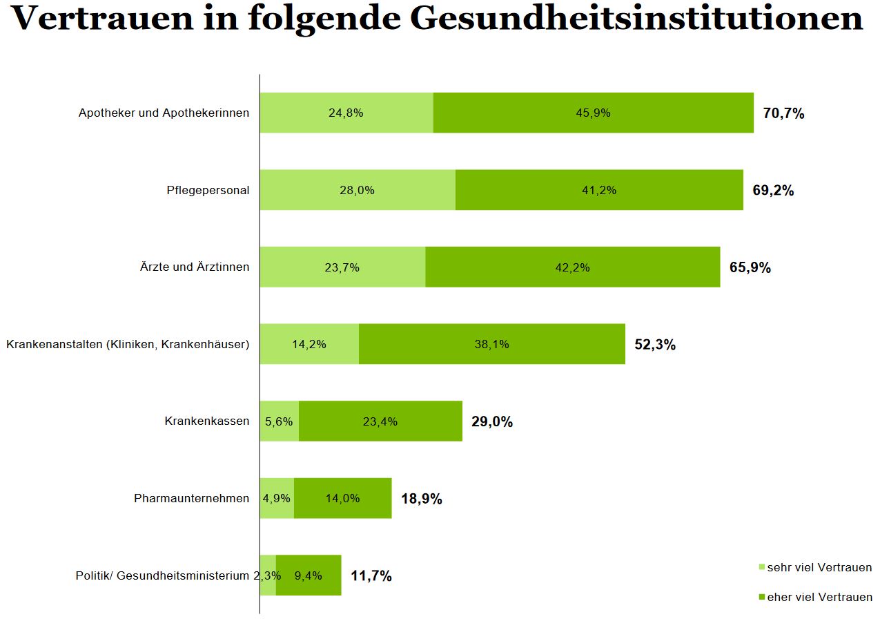 Das höchste Ansehen im Gesundheitswesen genießen mit 71 Prozent die Apothekerinnen und Apotheker, dicht gefolgt vom Pflegepersonal (69 Prozent) sowie Ärztinnen und Ärzten (66 Prozent). Immerhin noch rund die Hälfte vertraut den Krankenanstalten, lediglich jeder Dritte den Krankenkassen. Die Schlusslichter des Rankings bilden die Pharmaunternehmen mit 19 Prozent und das Gesundheitsministerium mit zwölf Prozent.