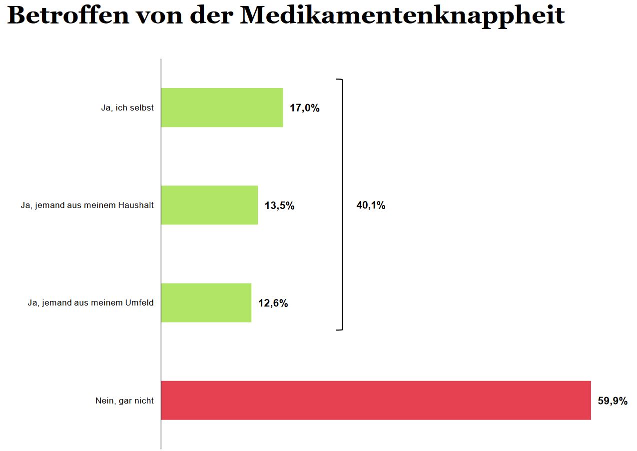 17 Prozent der 1.000 befragten Österreicherinnen und Österreicher zwischen 14 und 75 Jahren gaben an, selbst von den Engpässen betroffen zu sein. 14 Prozent kennen zumindest Betroffene im eigenen Haushalt und/oder 13 Prozent jemanden im engeren Umfeld.