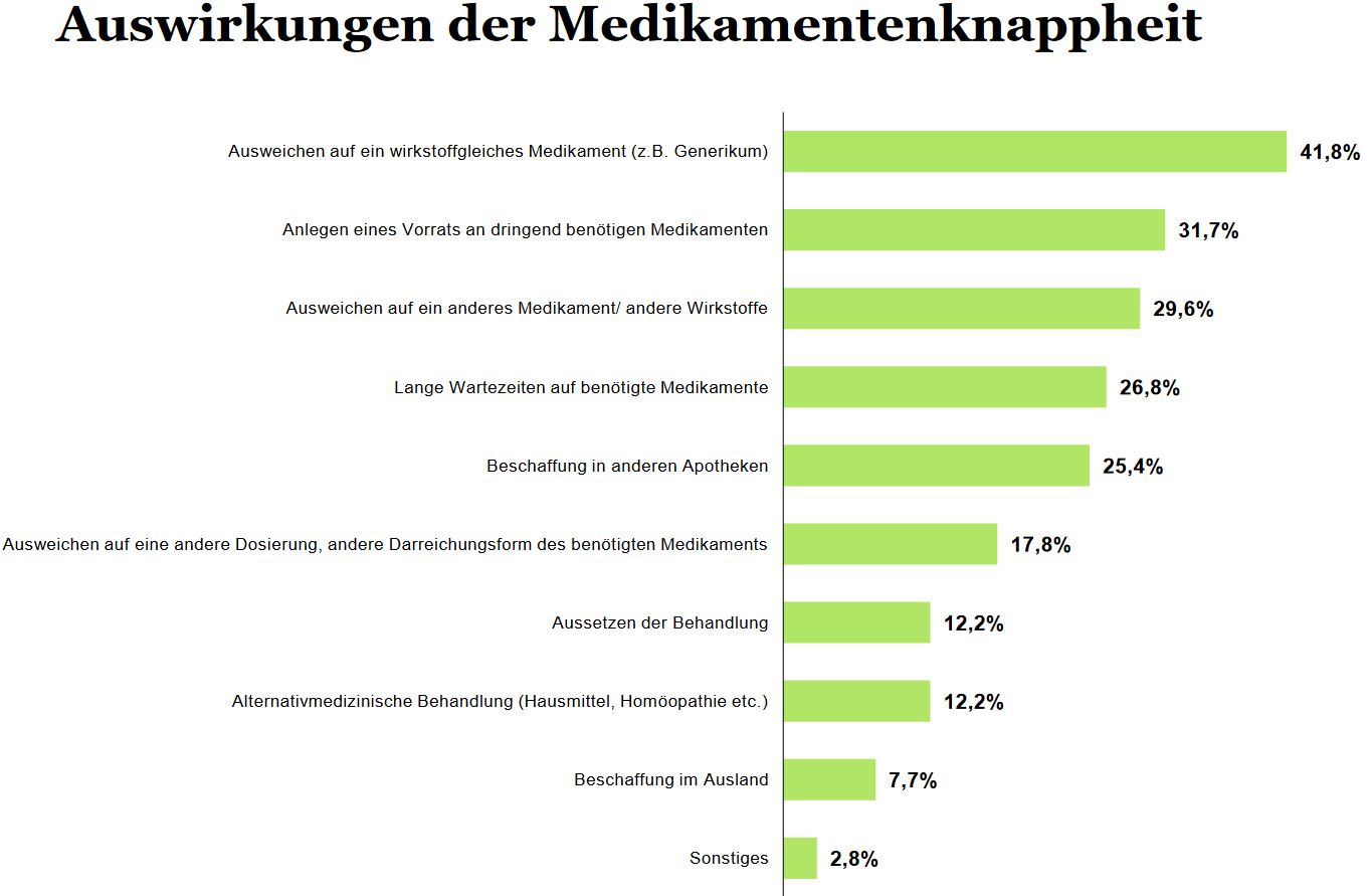 42 Prozent der Betroffenen können als Alternative auf wirkstoffgleiche Medikamente wie Generika zurückgreifen, 30 Prozent weichen auf Arzneimittel mit anderen Wirkstoffen aus. Fast ein Drittel versucht durch das Anlegen eines Vorrats an dringend benötigten Arzneien der Lage Herr zu werden. Jeweils rund jeder Achte versucht ein Aussetzen der Behandlung bzw. den Umstieg auf alternativmedizinische Lösungen.