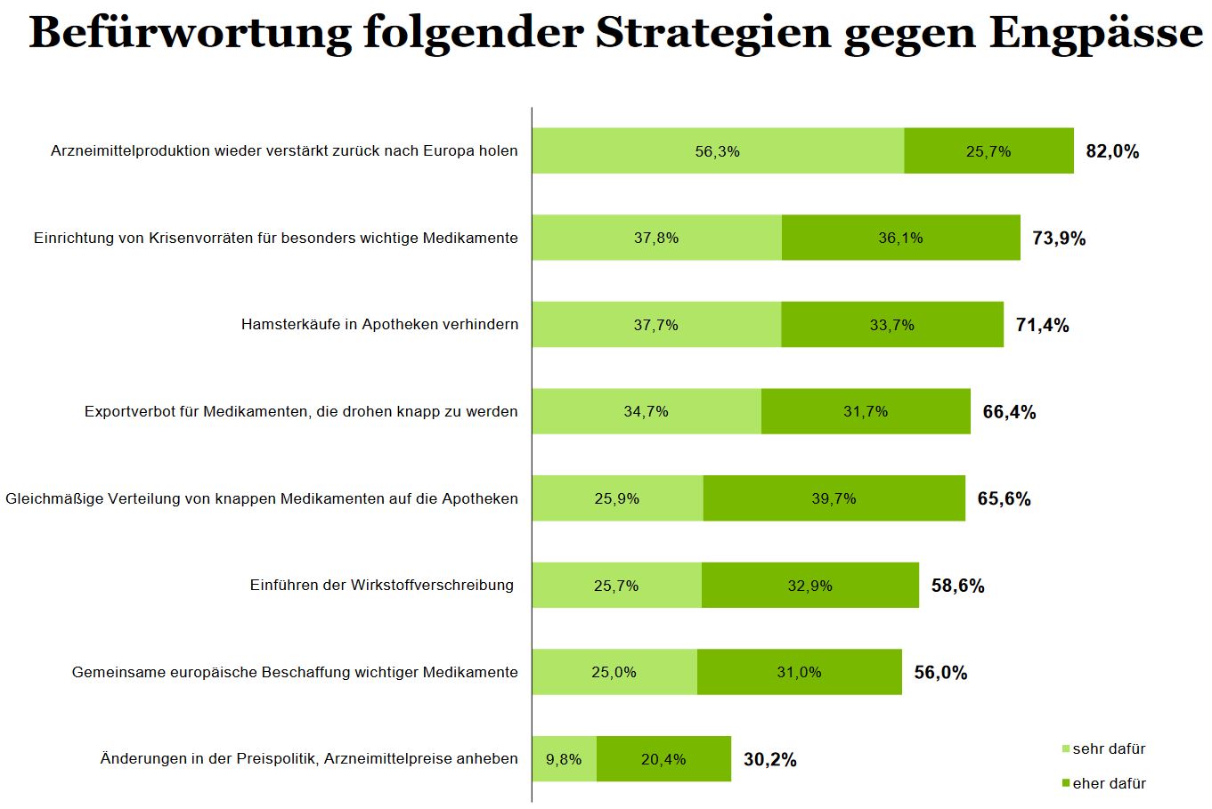 Der Vorschlag einer Rückholung der Arzneimittelproduktion nach Europa wird von acht von zehn Befragten unterstützt. Auch die Einrichtung von Krisenvorräten besonders wichtiger Medikamente befürwortet ein Großteil (74 Prozent). Die Einführung der Wirkstoffverschreibung stößt bei fast sechs von zehn Befragten auf Zuspruch. Deutlich weniger positiv stehen die Österreicher einem Anheben der Arzneimittelpreise gegenüber, hier sind nur zehn Prozent sehr und 20 Prozent eher dafür.
