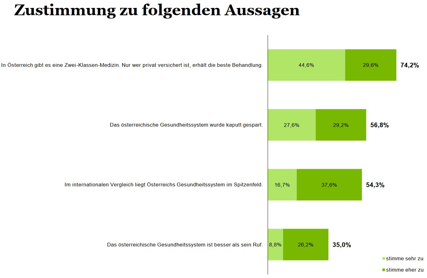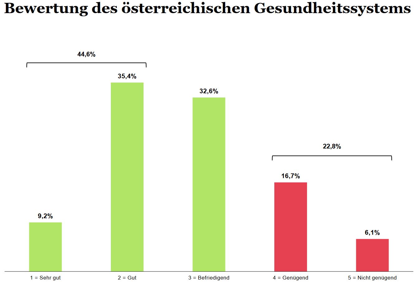 Die durchschnittliche Schulnote, die die Befragten dem heimischen Gesundheitssystem ausstellen, tendiert mit 2,8 stark in Richtung "befriedigend", berichtete Marketagent. Lediglich 45 Prozent der Befragten stellen ein "gutes" oder "sehr gutes" Zeugnis aus. Fast jeder Vierte (23 Prozent) würde sogar nur ein "genügend" oder "nicht genügend" vergeben.