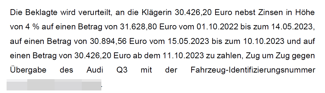 In seinem Urteil stellte das Gericht fest, dass der Hersteller durch das gezielte Verschweigen der Technik eine arglistige Täuschung begangen habe. Die Klägerin erhält gegen Rückgabe des Fahrzeugs 30.426,20 Euro – abzüglich eines Benützungsentgelts von 4.873,80 Euro.