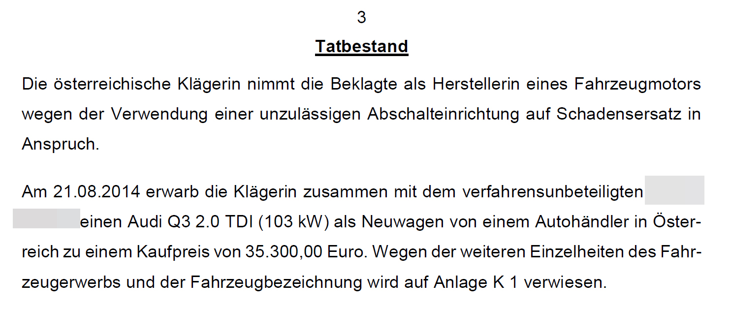 Die Vorarlbergerin hatte 2014 einen Audi Q3 TDI als Neuwagen zum Kaufpreis von 35.300 Euro erworben. Das Fahrzeug war mit einem Dieselmotor ausgestattet, der durch eine sogenannte „Umschaltlogik“ auf dem Prüfstand deutlich niedrigere Abgaswerte ausgab als im regulären Straßenbetrieb.