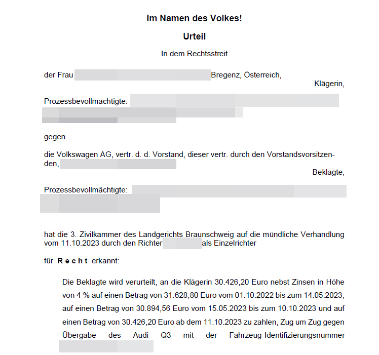 In einem Urteil vom November 2023 hat eine Fahrzeughalterin aus Bregenz vor einem deutschen Gericht Schadenersatz gegen einen Autohersteller erwirkt. VOL.AT liegen detaillierte Informationen zum Fall vor.