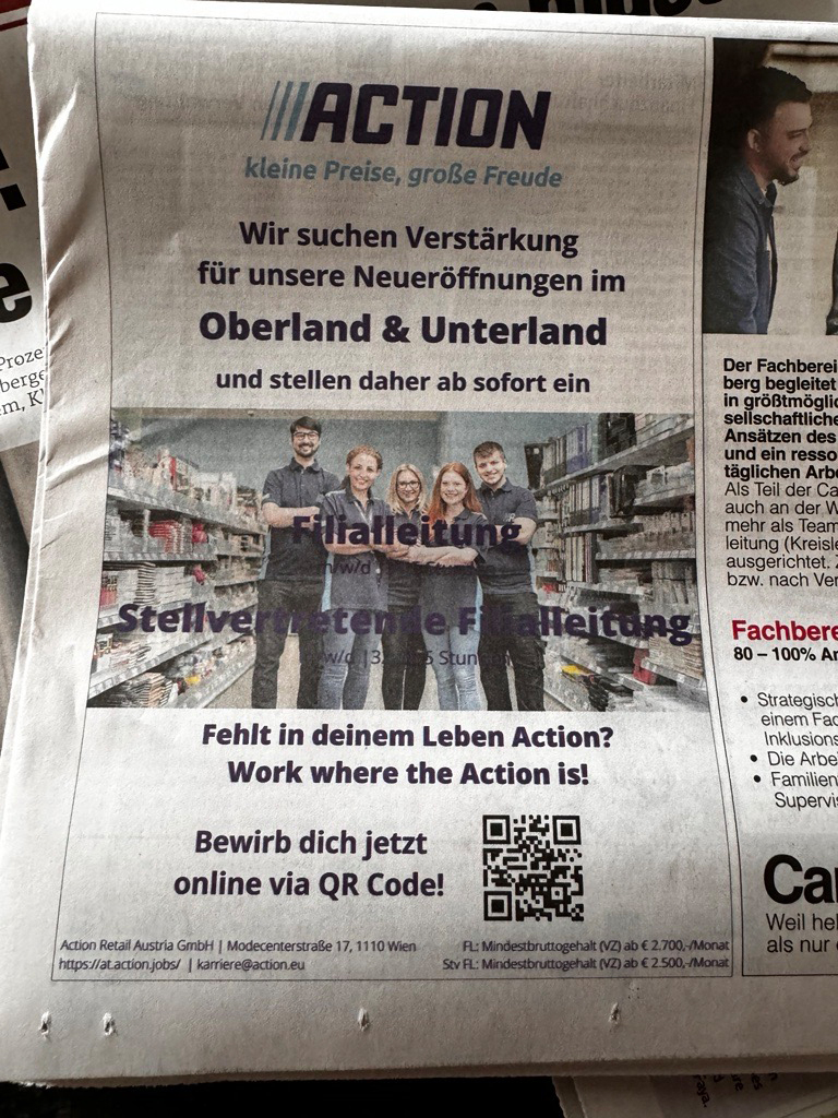 Action ist einer der größten Non-Food-Discounter in Europa. Im Jahr 2021 wurde in Hard eine erste Vorarlberger Filiale eröffnet. Action will weiter wachsen und mehrere Filialen im Ländle eröffnen. Mitarbeiter werden bereits gesucht.