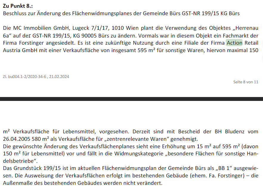 "Vormals war in diesem Objekt ein Fachmarkt der Firma Forstinger angesiedelt", heißt es im Protokoll. "Es ist eine zukünftige Nutzung durch eine Filiale der Firma Action Retail Austria GmbH mit einer Verkaufsfläche von insgesamt 595 m² für sonstige Waren, hiervon maximal 150 m² Verkaufsfläche für Lebensmittel, vorgesehen." Es soll noch anpassende Umbauten geben, die Ausmaße des Gebäudes werde aber nicht verändert.