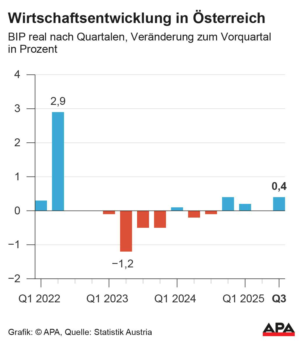 In the annual comparison, the positive trend continues: After an increase of 0.1 percent in the first and 0.4 percent in the second quarter of 2025, the real GDP in the third quarter was 0.9 percent higher than in the corresponding period of the previous year. The quarterly view also shows a gradual revival - from 0.2 percent growth in the first quarter through stagnation in the second to now 0.4 percent increase.