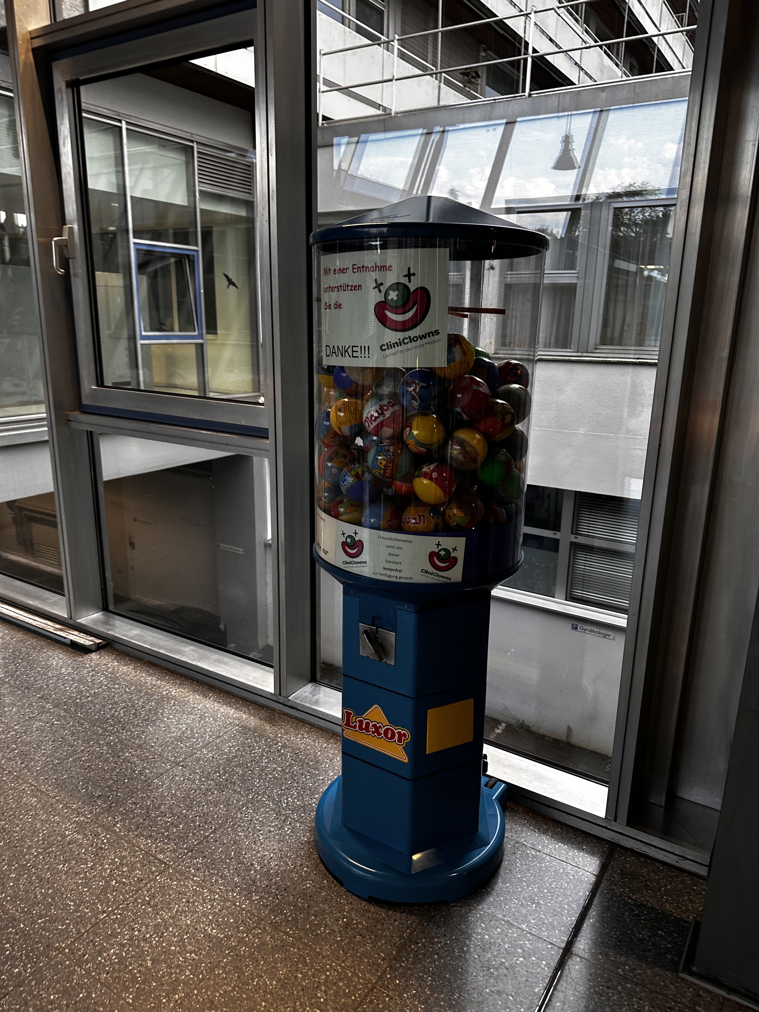 Als Erstes gibt es eine bemerkenswerte Initiative, die Lachen und Freude in die Korridore und Zimmer des Krankenhauses bringt: Die Clini Clowns. Im LKH Feldkirch finden Sie Clini Clown-Automaten, die für nur zwei Euro ein Spielzeug in einer Plastikkugel ausgeben.