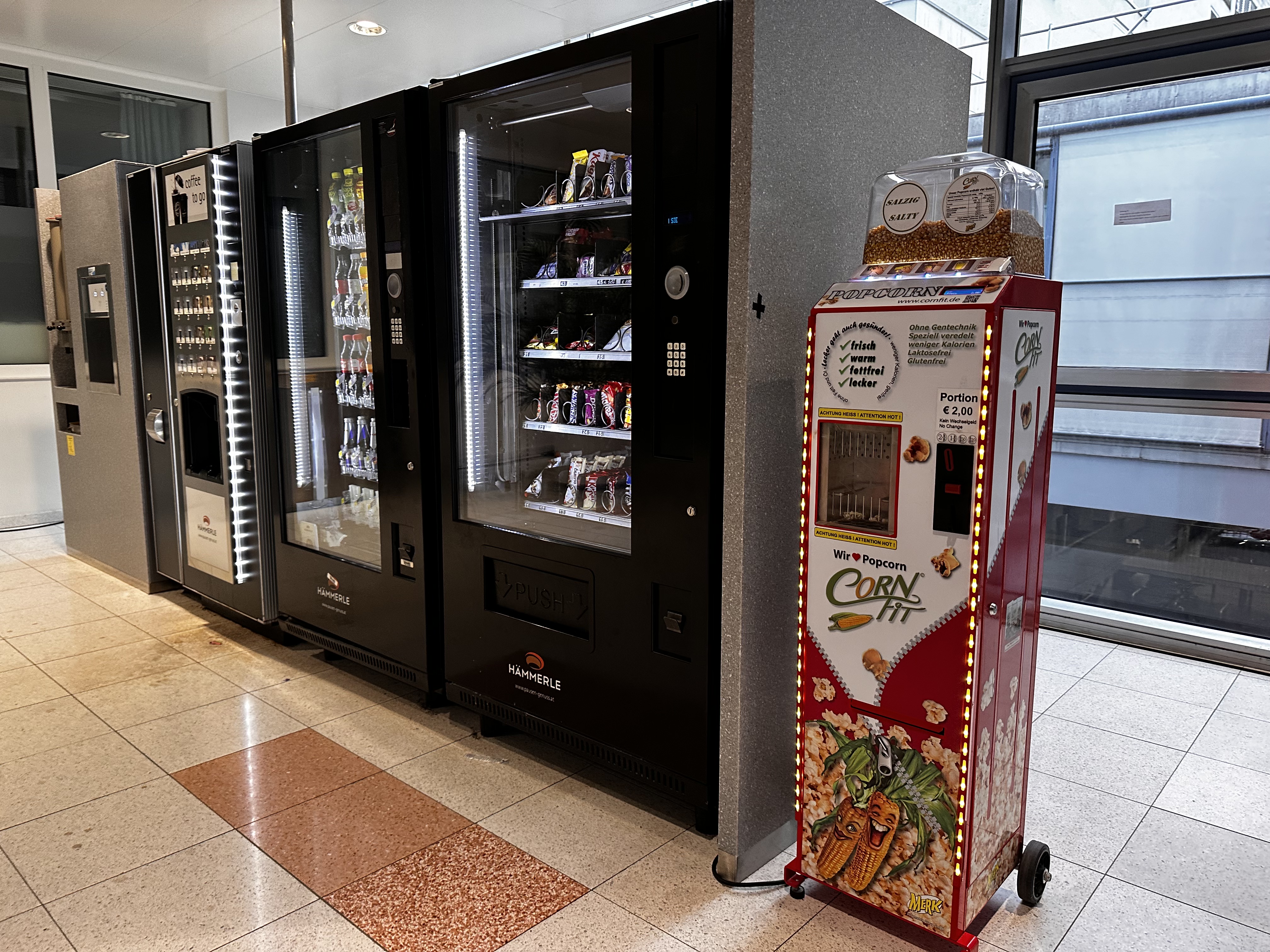Der dritte Grund führt uns in den Bereich Ost des LKH Feldkirch. Auch hier stehen Automaten bereit, die mit Kleingeld funktionieren. Neben den üblichen Automaten für Snacks und Getränke gibt es hier eine Besonderheit: eine Popcorn-Maschine. Ob als kleiner Snack für den Patienten oder als Ablenkung für die mitgebrachten Kinder – ein wenig Popcorn kann den Krankenhausaufenthalt oder -besuch ein kleines Stück angenehmer gestalten.