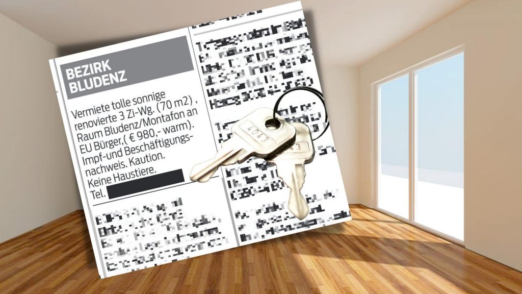 Angeboten wird eine Dreizimmerwohnung im Bezirk Bludenz. Neben Kaution und Beschäftigungsnachweis wird auch ein Impfnachweis verlangt.