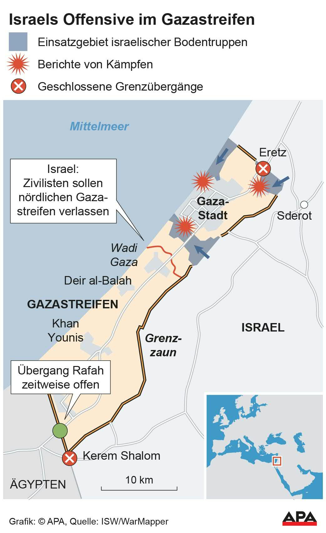 Die Hamas setzte unterdessen die Evakuierung von Ausländern und Menschen mit doppelter Staatsbürgerschaft aus dem Gazastreifen nach Ägypten aus. Grund sei die Weigerung Israels, verletzte Palästinenser in ägyptische Krankenhäuser bringen zu lassen, sagte ein Vertreter der Grenzübergangsverwaltung der Nachrichtenagentur AFP. "Kein ausländischer Passinhaber darf den Gazastreifen verlassen, bevor die Verletzten, die aus den Krankenhäusern im nördlichen Gazastreifen evakuiert werden müssen, zum Grenzübergang Rafah transportiert werden können", sagte der Beamte, der nicht namentlich genannt werden wollte. Nach US-Angaben hatte die Hamas versucht, über den zeitweise geöffneten Grenzübergang Rafah eigene Kämpfer aus dem Gazastreifen hinaus zu schleusen.