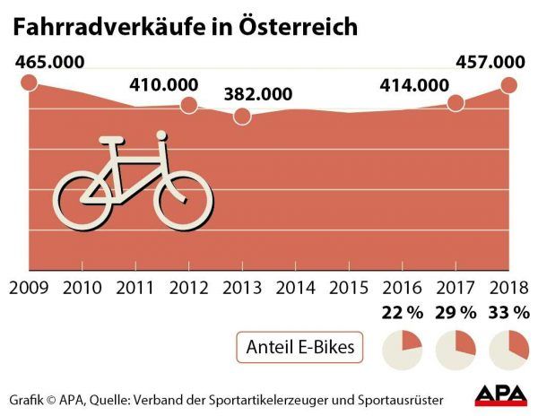 Mit dem Fahrradmarkt in Österreich ist es 2018 das dritte Jahr in Folge aufwärts gegangen. Vor allem dank der E-Bikes lief es rund: Deren Gesamtmarktanteil kletterte auf 33 Prozent. An den Fachhandel insgesamt verkauft wurden 457.000 Fahrräder (2017: 414.000), so der Verband der Sportartikelerzeuger und Sportausrüster Österreichs (VSSÖ) gegenüber der APA.