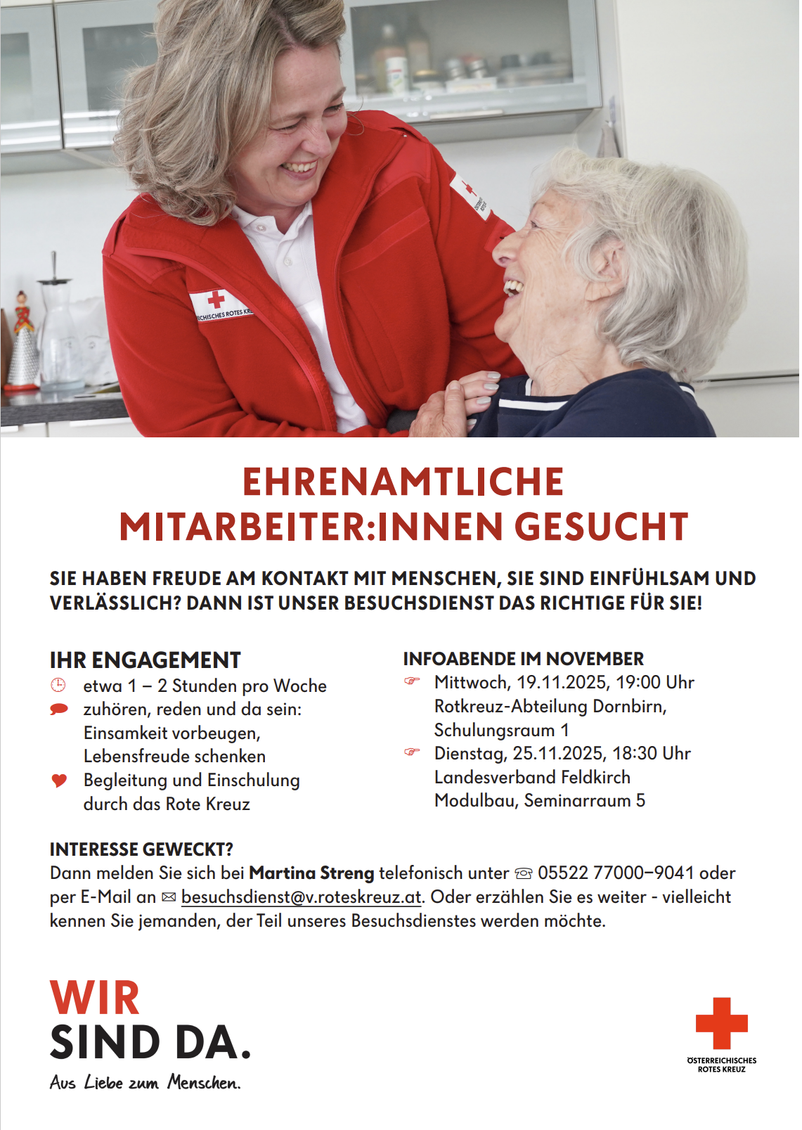 Wer Interesse hat, sich zu engagieren, kann im November an einer der beiden Informationsveranstaltungen teilnehmen. Diese finden am Mittwoch, 19. November, um 19.00 Uhr in der Rotkreuz-Abteilung Dornbirn sowie am Dienstag, 25. November, um 18.30 Uhr im Rotkreuz-Landesverband in Feldkirch statt. Anmeldungen sind per Mail an besuchsdienst@v.roteskreuz.at möglich.
