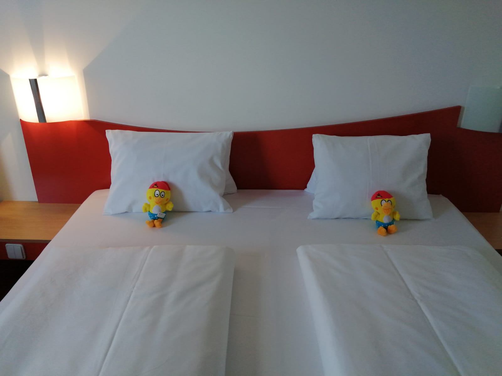 Den Lift soll laut Aushang jeweils nur ein Haushalt gemeinsam benutzen. Die Zimmer finden wir großartig wie gewohnt vor, wobei die Kinder angesichts von zwei Hopi-Ho-Kuscheltieren, die sie als Goodie im Bett erwarten, in Jubel ausbrechen. Schon bei unserem ersten Besuch war die Begeisterung über das parkseitige Doppelzimmer mit Verbindungstüre, zwei Bädern, zwei Fernsehern und schönem Ausblick auf die Außenpools der Anlage groß. Da wir diesmal in der wärmeren Jahreszeit anreisen, erwarten die Kinder weitere Highlights außerhalb des Hauses, wie mehrere Spielplätze und eine Riesen-Hüpfburg. Auch zahlreiche Liegen im Freien stehen in der weitläufigen Anlage zur Verfügung.