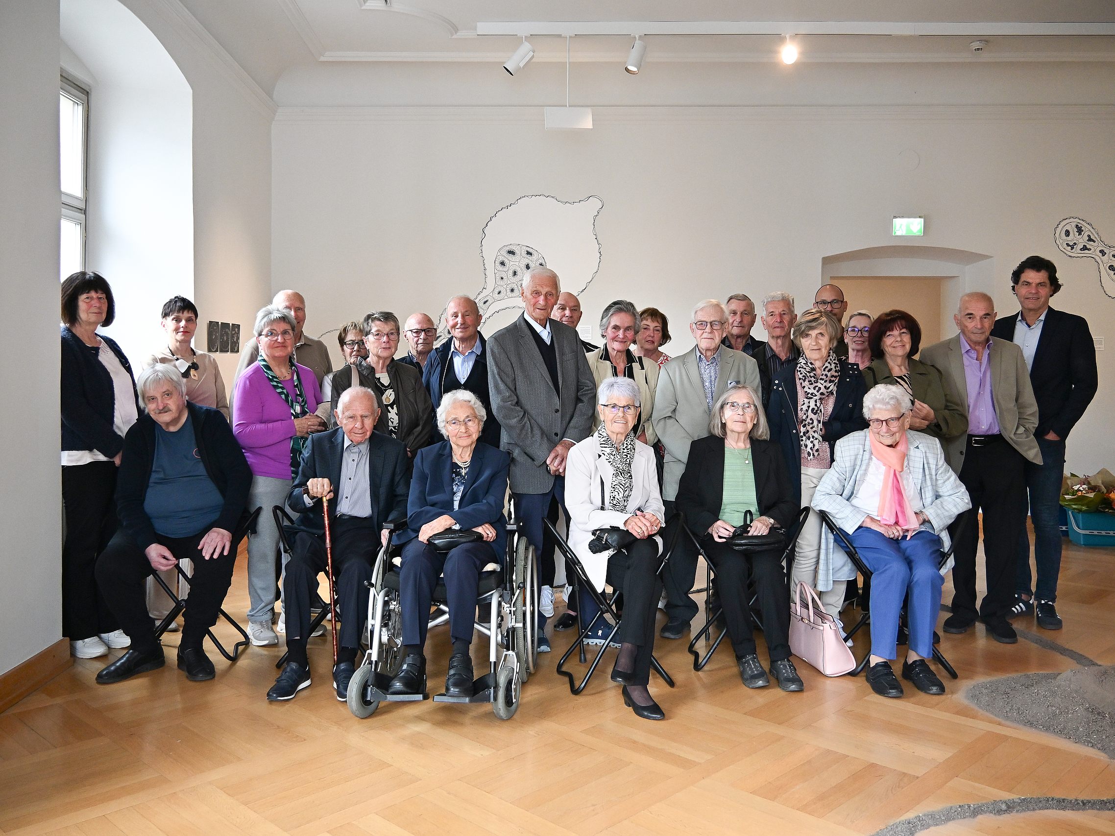 Nach einem Sektempfang folgte eine gemütliche Kaffeerunde mit Kuchen, in der sich die Gäste untereinander austauschten und Erinnerungen teilten. Im Anschluss entstand ein gemeinsames Gruppenfoto, außerdem wurde jedes Paar mit Bürgermeister Rädler einzeln fotografiert. Dieses Erinnerungsfoto wird den Jubilar:innen als Geschenk der Stadt Feldkirch in den kommenden Wochen zugestellt.