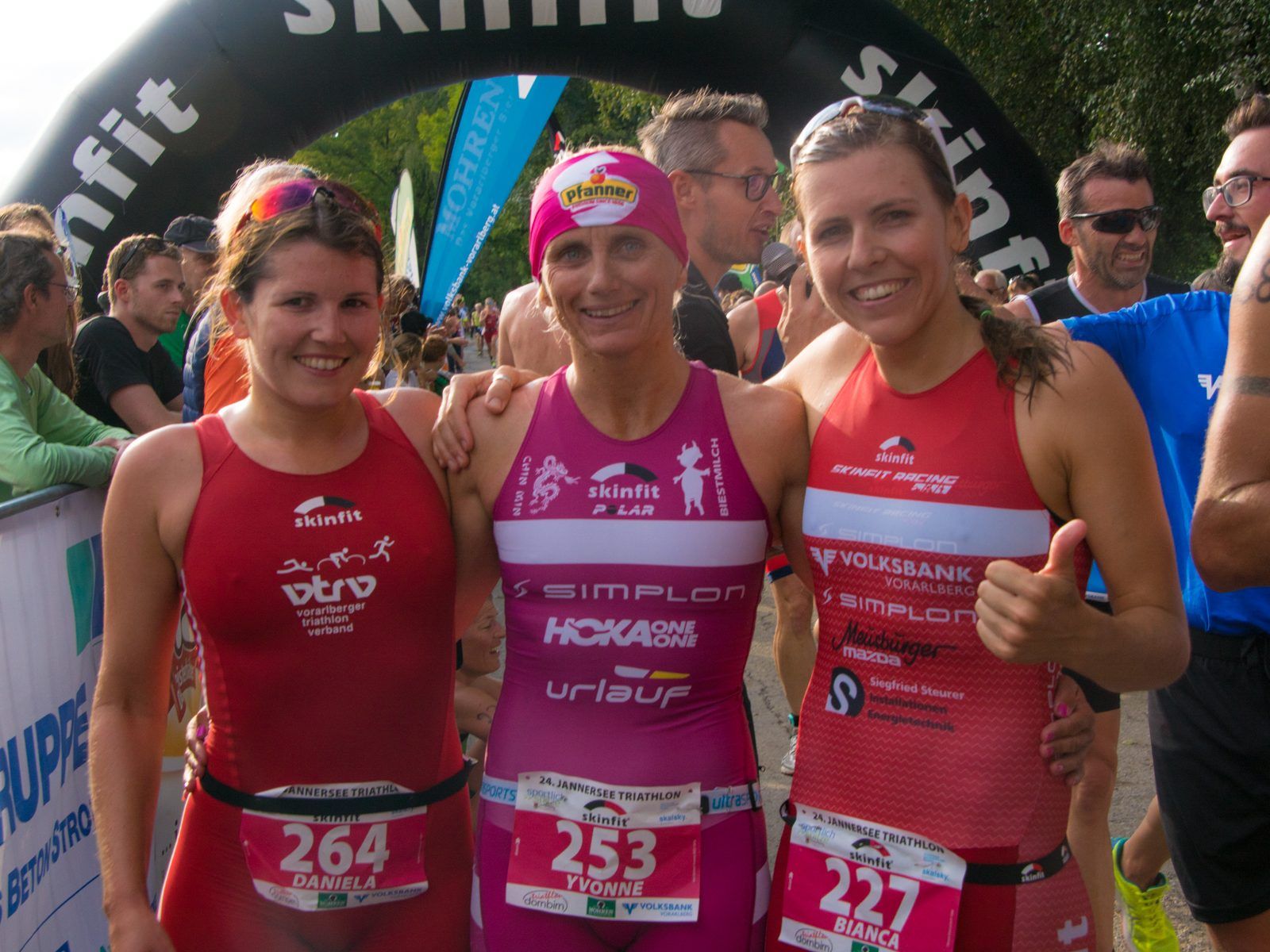Bei den Damen wechselte die Führung nach jeder Disziplin, beim Schwimmen stieg Daniela Bader (Tri Dornbirn) als Erste aus dem Wasser. Danach übernahmen die starken Radfahrerinnen und Favoritinnen Bianca Steurer und Yvonne van Vlerken (beide RV Dj’s Bikeshop Simplon Hard) das Ruder. Sie kamen gleichzeitig in die Wechselzone, dort passierte Steurer ein kleines Missgeschick und somit verlor sie wertvolle Sekunden. Die starke Wahlvorarlbergerin Van Vlerken sorgte mit der schnellsten Laufzeit für einen letztendlich klaren Sieg.