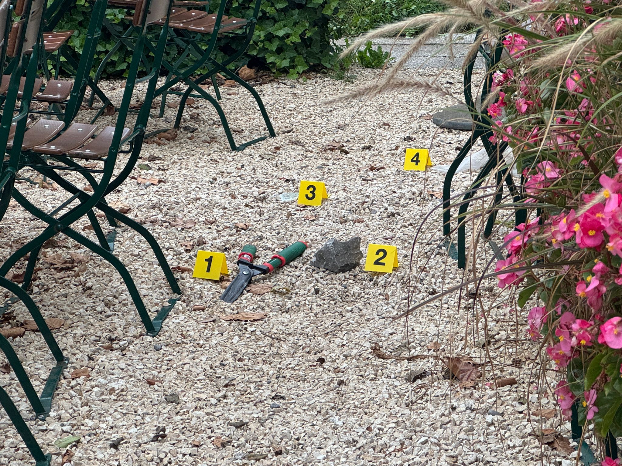 Ein großes Loch im Fenster und nummerierte Tatort-Schilder am Boden: Die Polizei ermittelt in Wolfurt, nachdem in der Nacht auf Donnerstag in Toni's Imbiss eingebrochen wurde.