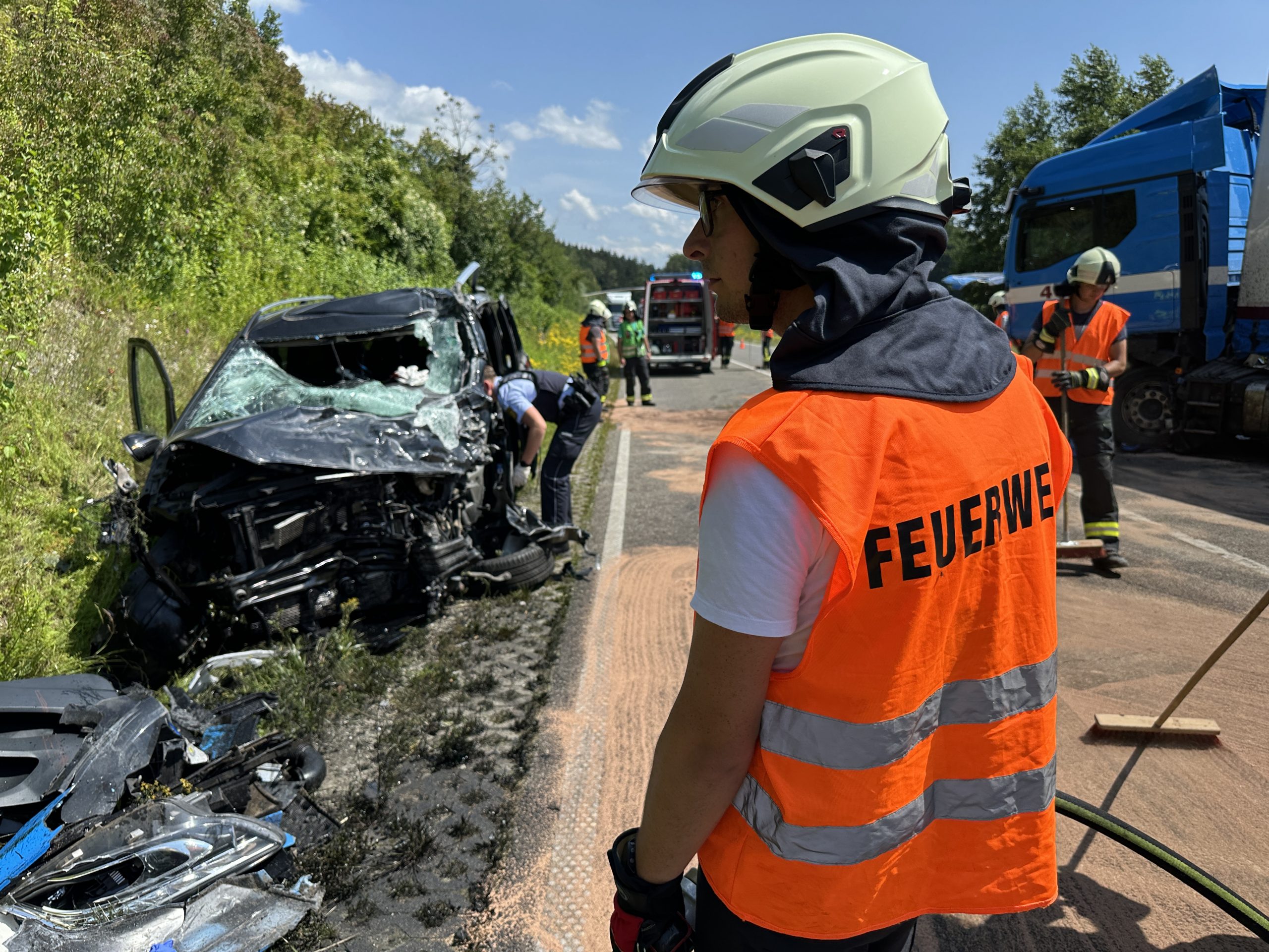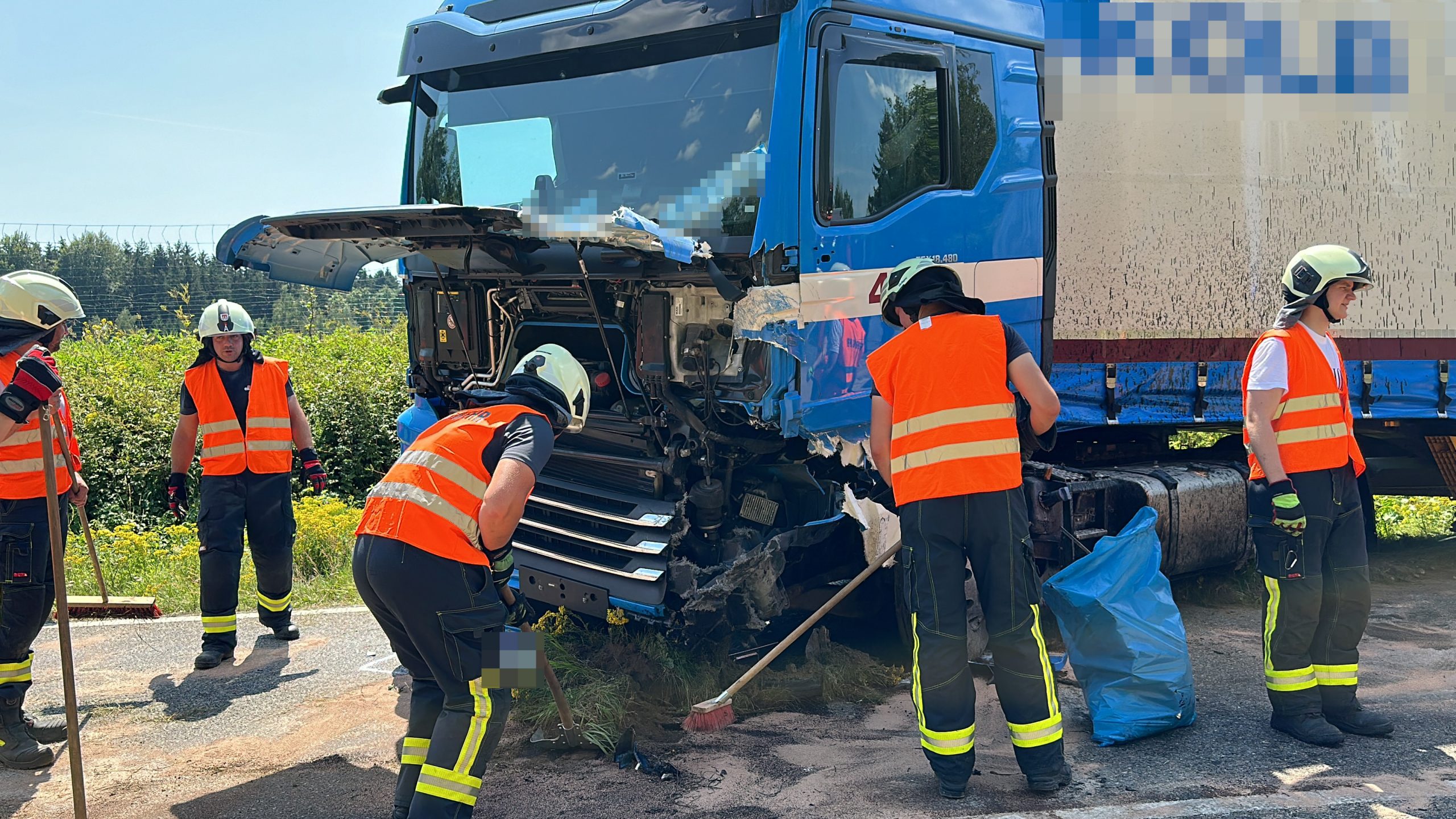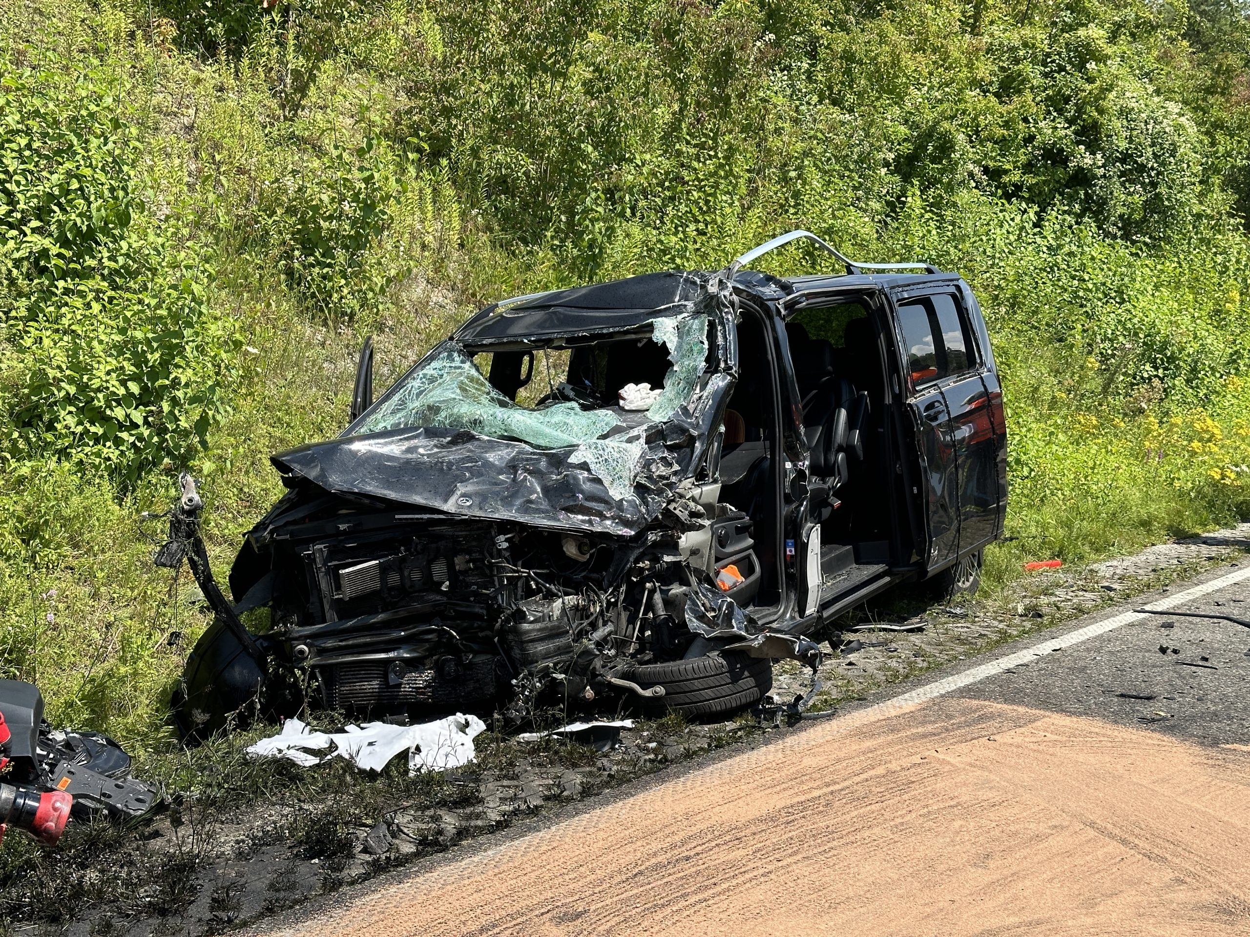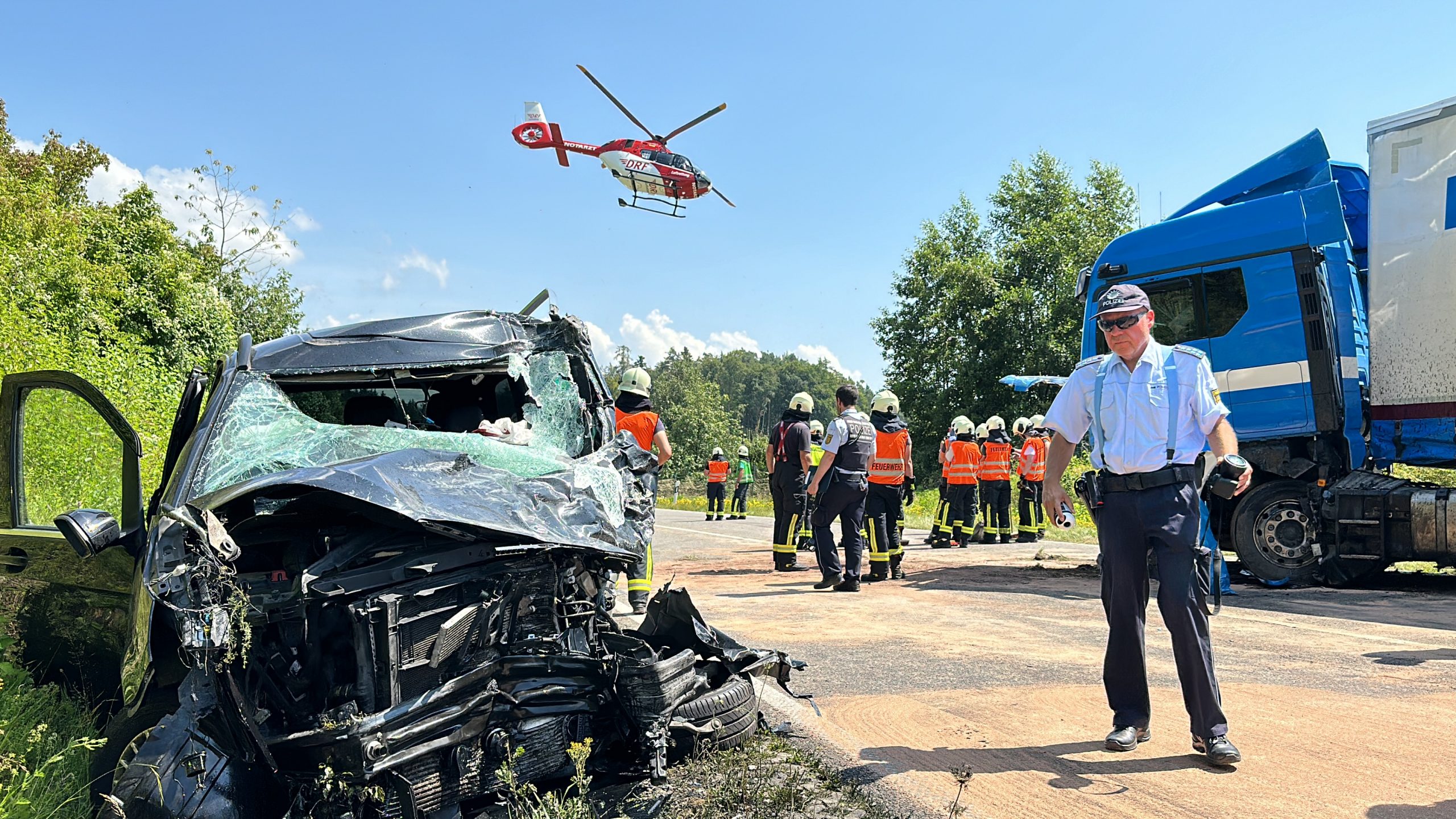 Der 30-jährige Lkw-Fahrer wurde leicht verletzt, der Insasse im Kleinbus wurde an der Unfallstelle reanimiert und in ein Krankenhaus geflogen. Er gilt aktuell als schwerstverletzt.