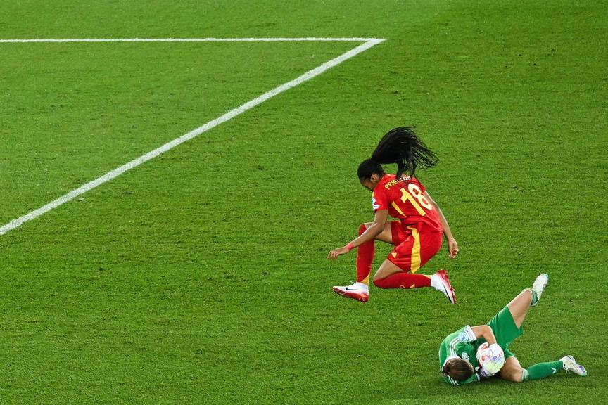 Spanien und Bonmatí eroberten aber immer öfter den gegnerischen Strafraum. Nach einem Eckball köpfte Kapitänin Irene Paredes an den Pfosten - Berger wäre machtlos gewesen (41.). Kurz darauf hielt die Torfrau vom US-Club Gotham FC einen Schuss ihrer Vereinskollegin Esther González. Gerade noch so rettete sich das Wück-Team ohne Gegentor in die Pause.