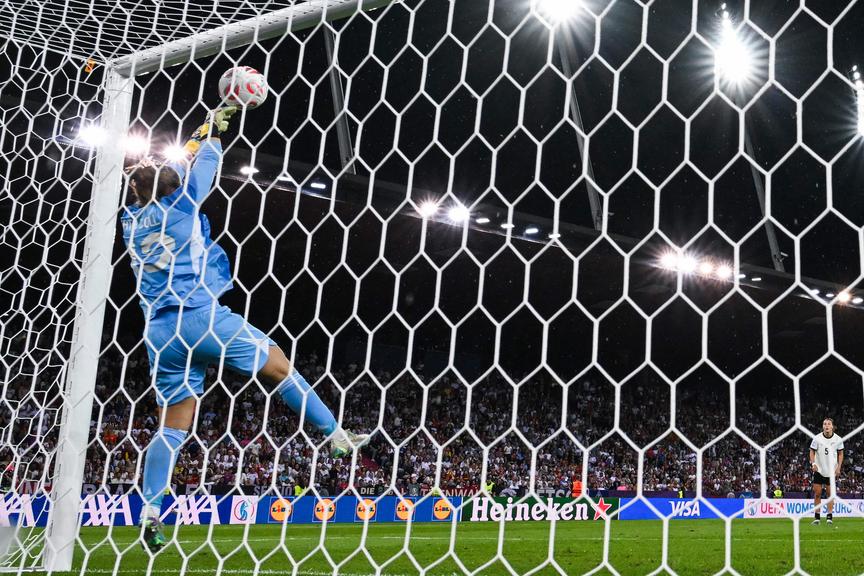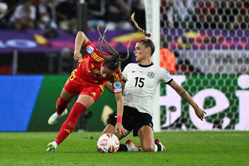 Dass all das im EM-Halbfinale 2025 keine Rolle mehr spielt, machten die Spanierinnen schnell klar. Das Team von Trainerin Montse Tomé ließ den Ball wie gewohnt laufen, die Deutschen hetzten hinterher. Noch bevor sich der Turnierfavorit die erste Chance erspielte, war nach einem weiten Abschlag Bergers plötzlich Klara Bühl durch. Ihr Flachschuss zischte am rechten Pfosten vorbei (8.).