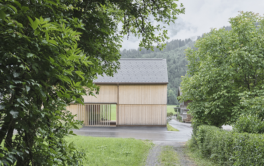 Das alte Gehöft des Vaters der Bauherrin war typisch für den Bregenzerwald: an einem Ende das Wohnhaus, am anderen der Stall, dazwischen der offene Schopf, alles unter demselben Satteldach. Es stand jahrzehntelang leer, die Bauherren wollten es wieder bewohnen. Sie informierten sich über Architekturbüros, fuhren monatelang durchs Land, gingen auf Bauvisiten und bei Führungen mit. „Je mehr wir sahen, umso klarer wurde uns, wie man mit Raum umgehen kann und was wir brauchen.“ Sie baten drei Architekten um einen Vorentwurf. „Alle waren da, teils sogar mehrfach und sahen sich das Grundstück an.“ Ursprünglich wollte das Paar wenigstens einen Teil des Bestands erhalten, unabhängig voneinander stellten die Architekten fest, dass das unmöglich war. Bernardo Bader rettete dessen Wesen, indem er die alte Bregen zerwälder Typologie mit den neuen Wohnbedürfnissen in Einklang brachte. „Interessant ist es, wenn zuerst der Ort und dann das Haus kommt“, sagt Bader. „Es befindet sich am spannungsvollen Eingang zum Dorf und verstärkt die Qualitäten des Bestands.“ In lapidarer Selbstverständlichkeit steht es in derselben Kubatur mit demselben Fußabdruck am selben Platz wie sein Vorgänger. An die 12,5 Meter breit, etwa 20 Meter lang, straßenseitig ganz geschlossen, mit einem Holzschirm aus sägerauen, vertikalen Fichtenlatten wirkt es wie ein Stadel. Ein Scheunentor bezeichnet den Eingang und die Zäsur zwischen dem Wohnhaus und dem einstigen Stall, wo nun das Auto und Fahrräder parken.