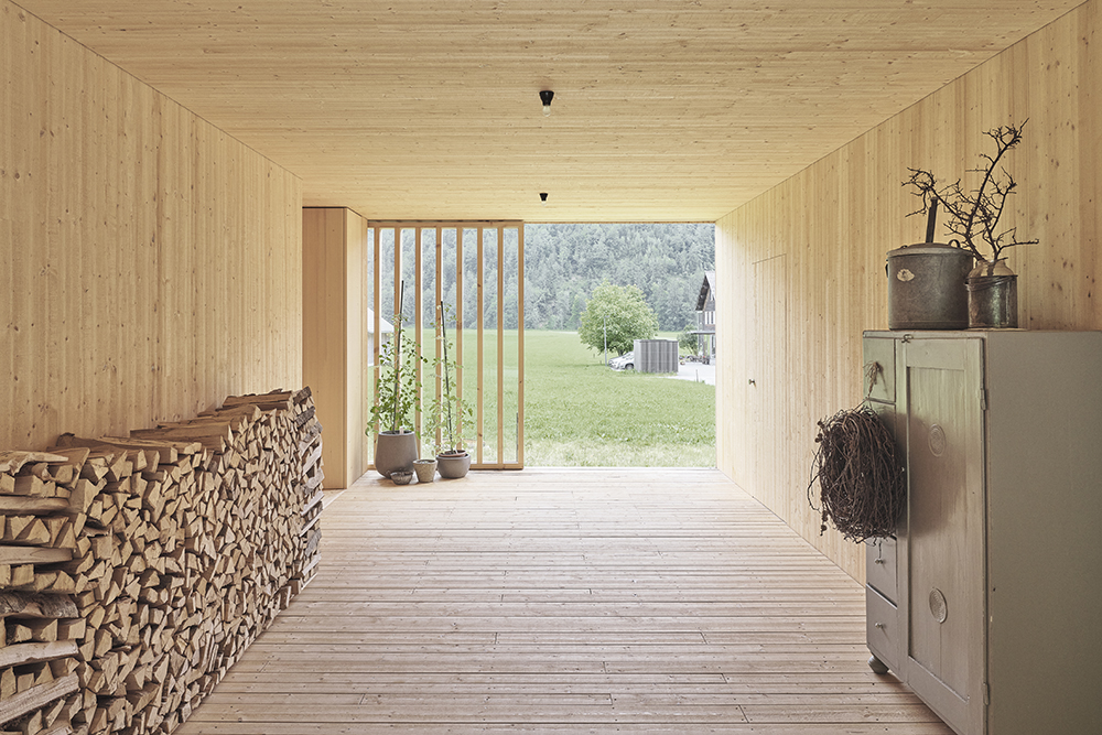 Das Scheunentor läuft in einer Schiene in der Trennlinie beider Geschoße. Schiebt man es beisei te, öffnet sich ein gedeckter Freiraum, der zugleich einen Durchgang zum Garten bildet. „Früher ist hier der Traktor durchgefahren“, erzählt der Bauherr. Man könnte ihn auch als innere Straße sehen: ihr wendet das Wohnhaus seinen Eingang zu, genau gegenüber ist die Tür in die Garage, zwei Schritte weiter biegt diese innere Straße einmal ums Eck auf die gedeckte Terrasse vor der großen Wohnküche ab. Eine Wandscheibe mit integriertem Kasten inszeniert subtil den Wechsel vom Durchgang zum gedeckten Freiraum am Garten. Diese braucht es auch zur Führung des schattenspendenden, gartenseitigen Scheunentors.