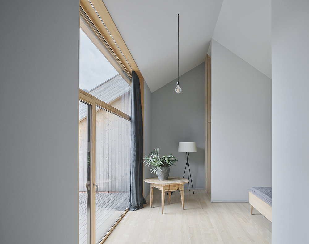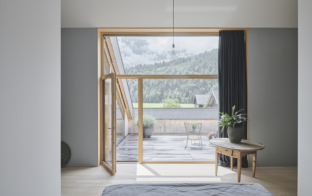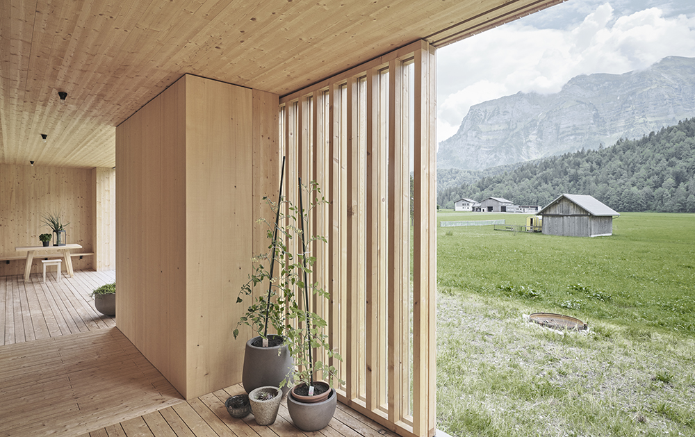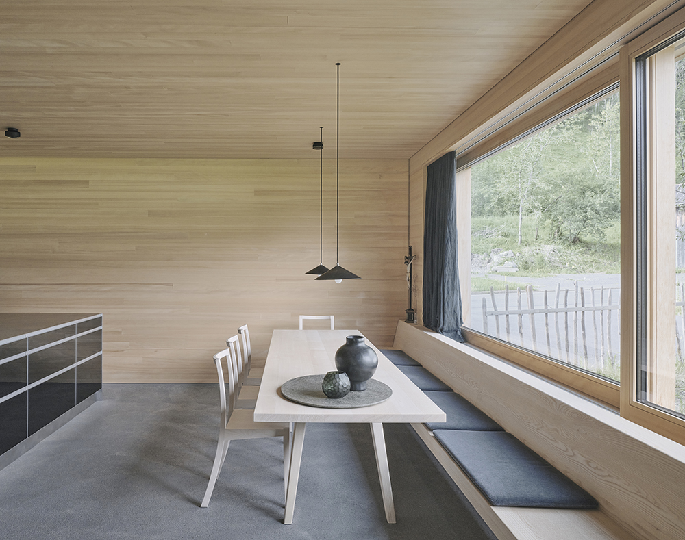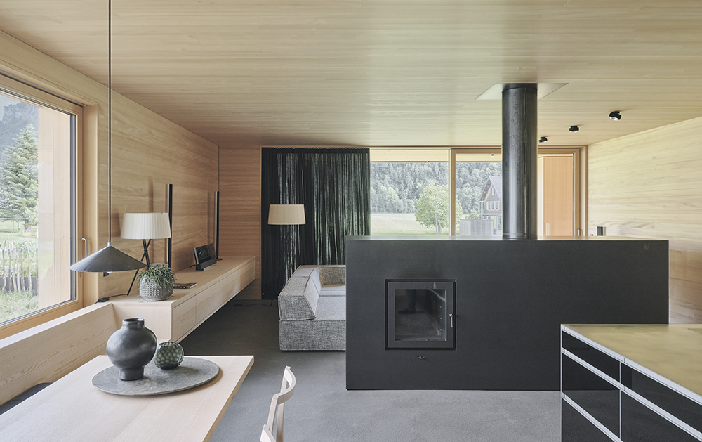 „Die größte Herausforderung an diesem Haus waren die Über - gänge zwischen Haus, Terrasse und Schopf zum Feld“, sagt Bader. Als Neuinterpretation des Schopfs definiert der Durchgang einen Bereich zum Queren, Ankommen, Lagern. Hier kann man Brennholz stapeln, Einkäufe abstellen, vor der Tür warten, auf die Straße schauen oder in den Garten gehen. Von dort sieht man Wiesen vor der mächtigen Silhouette der Kanis - fluh. Der erdgeschoßige Wohnbereich ist auf einem quadratischen Grundriss von etwa 9 x 9 Meter genauso diszipliniert zoniert. In der Mitte die Tür, rechts die Garderobe, dahinter das WC, links die zweiläufige Treppe nach oben. All das ist zu einem schmalen Streifen gebündelt, die rest - lichen sieben mal neun Meter bleiben dem Einraum zum Essen, Kochen, Wohnen. Der gesamte Raum ist mit Weißtanne getäfelt, nur der Boden aus Beton. Im Süden öffnet sich der Raum vollverglast mit Schiebetür zur Terrasse, im Westen ist die Außenwand windschützend vorgezogen. Die darin integrierte Bank setzt sich innen über die gesamte Hauslänge fort. Im Wohnbereich als Ablagebord, dann wird sie wieder zur Bank am Esstisch. Wer darauf sitzt, blickt in den Raum zum Herdblock, von den Sesseln aus sieht man durch das große Fenster im Osten di - rekt in das Dorf. Ein skulpturalreduzierter Kamin aus Schwarzstahl fungiert als Raumteiler zum Wohnen. Im Obergeschoß steigen die Räume bis zum First auf 4,50 Meter Höhe an. Diese Großzügig - keit allein ist schon ungewöhnlich, noch ungewöhnlicher aber sind die Freiräume. Vor jedem Schlafzimmer ist am Gebäudeeck eine Terrasse ins Dach eingeschnitten.