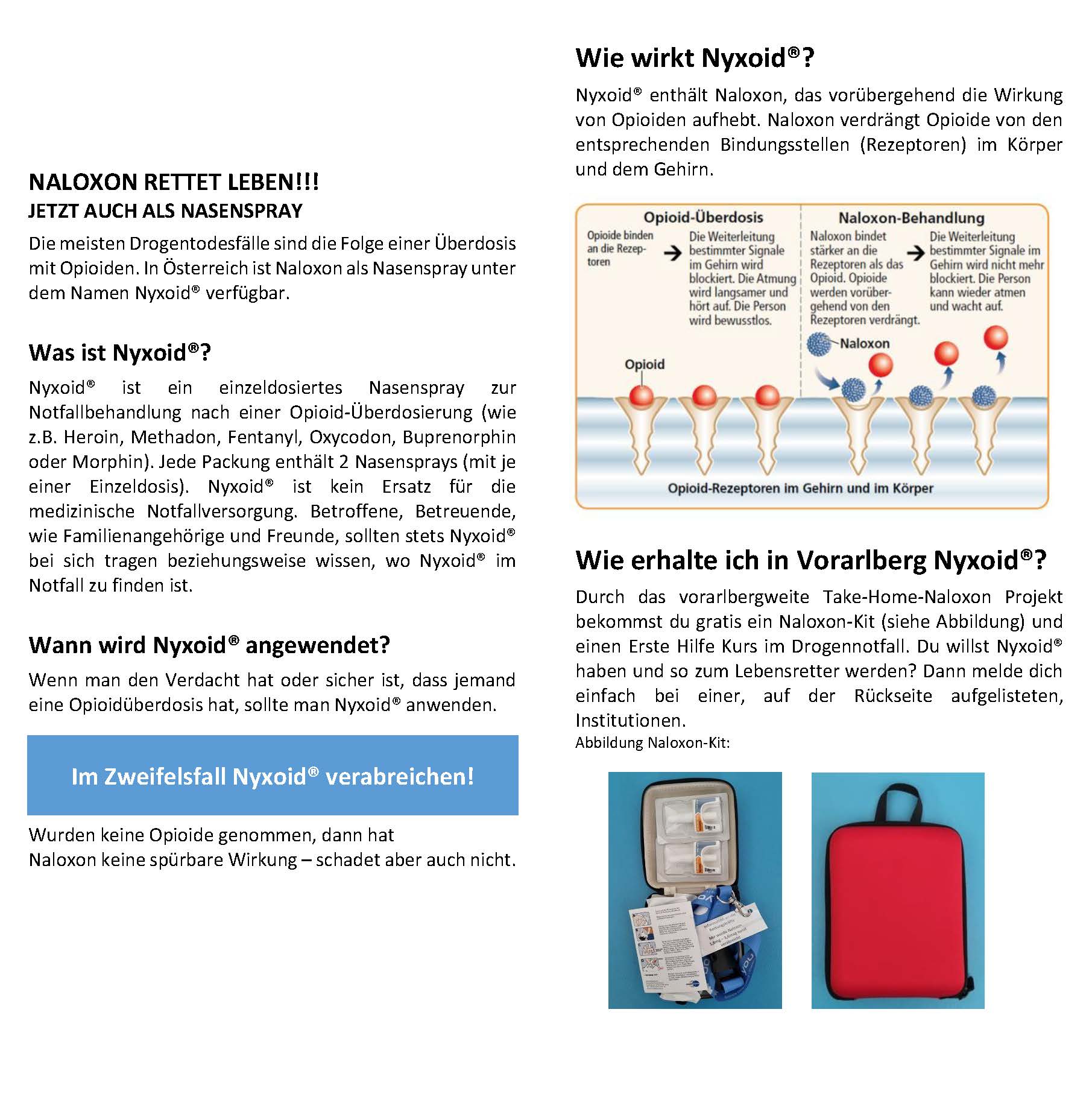 "Das Naloxon Nasenspray blockiert die Rezeptorenanbindung der Droge für den Zeitraum von ungefähr einer halben Stunde. Damit normalisieren sich kurzzeitig Atmung und Kreislauf – in so einem Fall zählt jede Sekunde bis zum Eintreffen der Rettungskräfte", führt der Bludenzer Suchtberater weiter aus.