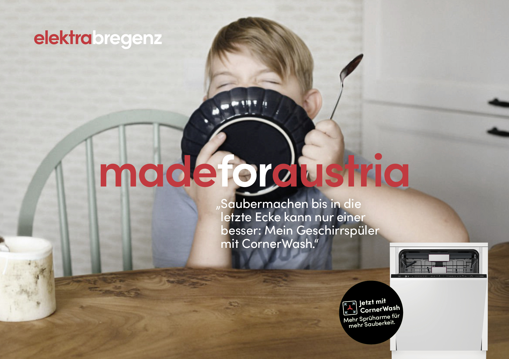 Um einen ersten Einblick zu geben, wurden im Rahmen der Strategie-Präsentation auch erste Werbesujets vorgestellt. Eines rückt zum Beispiel das elektrabregenz Geschirrspül-Feature CornerWash in den Mittelpunkt. Ein kleiner Junge schleckt seinen Teller ab und verweist darauf, dass nur der Geschirrspüler mit CornerWash sein Geschirr so sauber bekommt – wie er selbst.