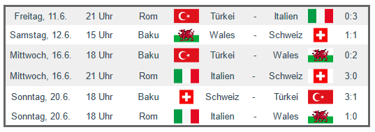 In der Gruppe A treffen bei der EM 2021 Türkei, Italien, Wales und die Schweiz aufeinander. Die Austragungsorte sind Baku und Rom. Hier finden Sie den Spielplan, alle Ergebnisse und die Tabelle.