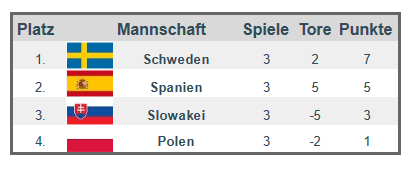 - Teams: Spanien, Schweden, Polen, Slowakei