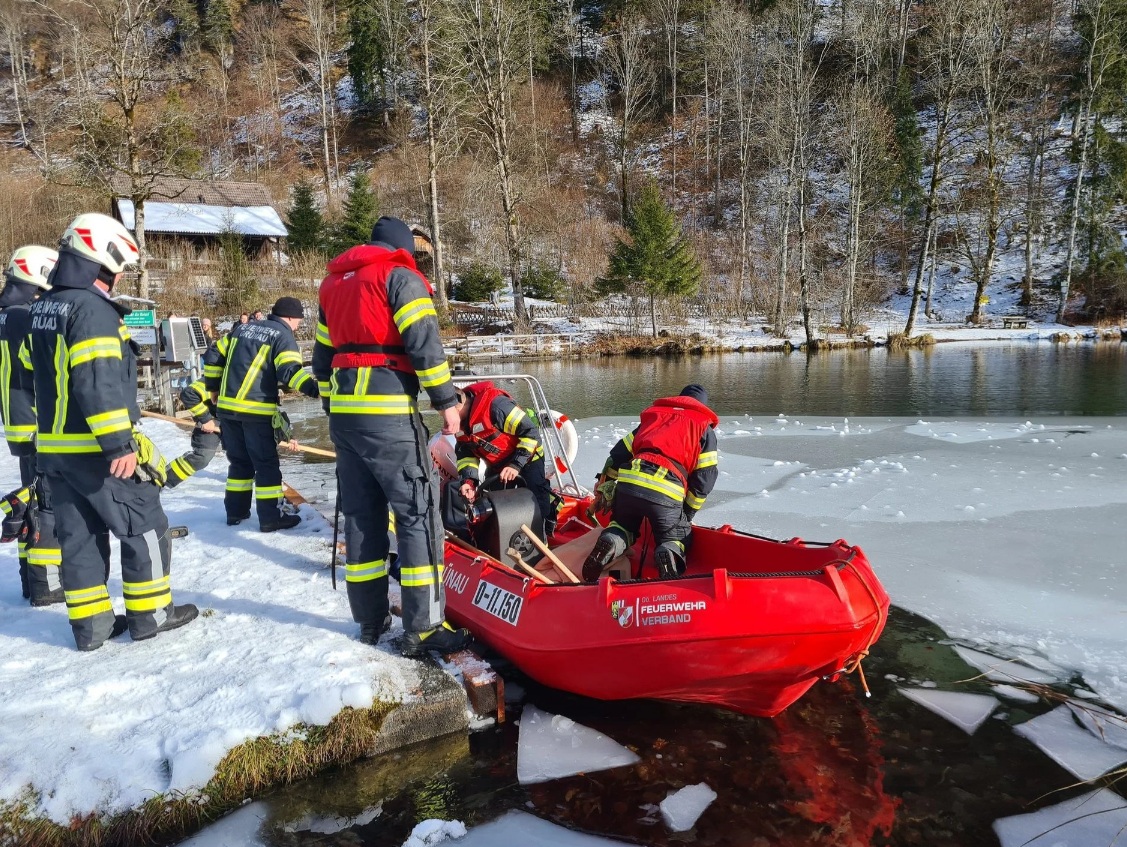 A swan was trapped in the frozen Almsee in Upper Austria on Sunday. The fire department was able to free the animal with a rescue boat.
