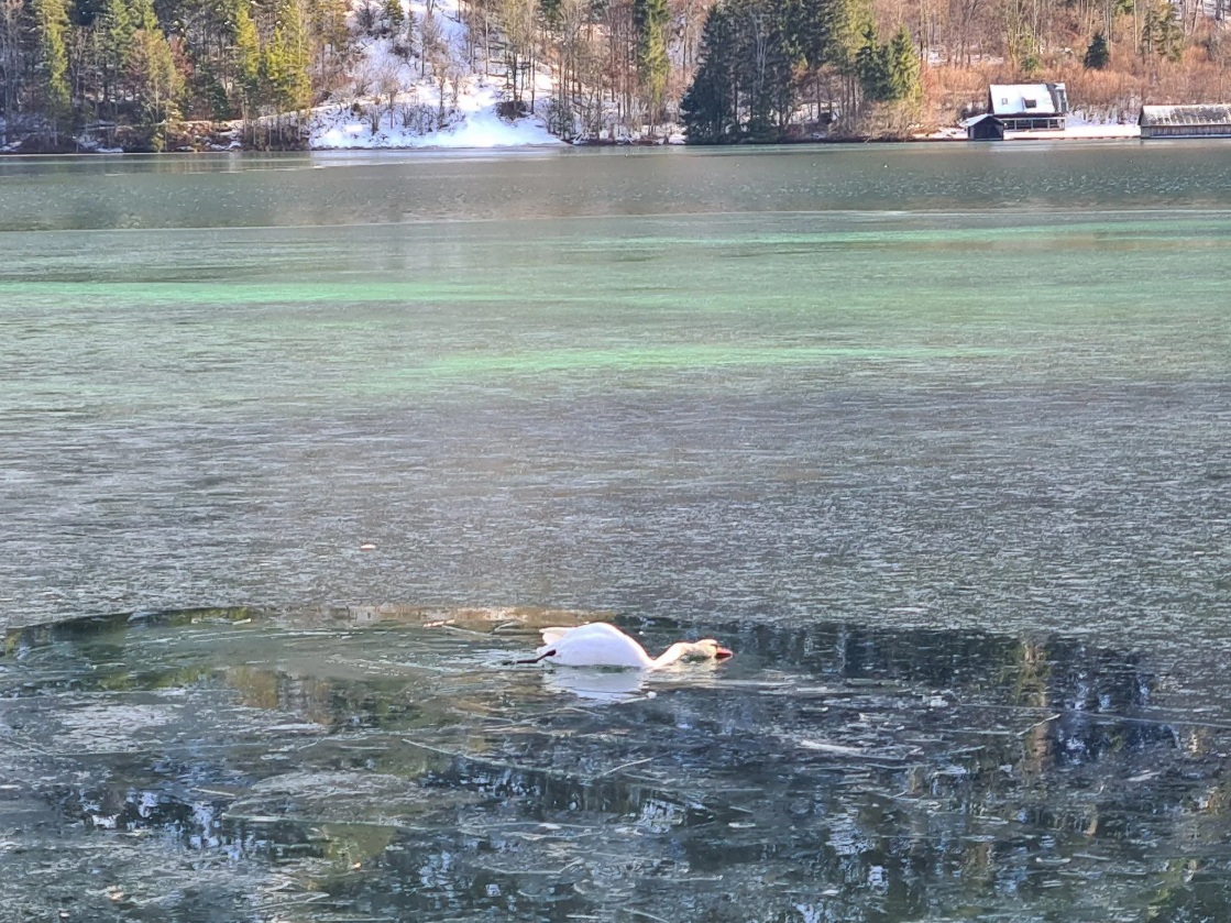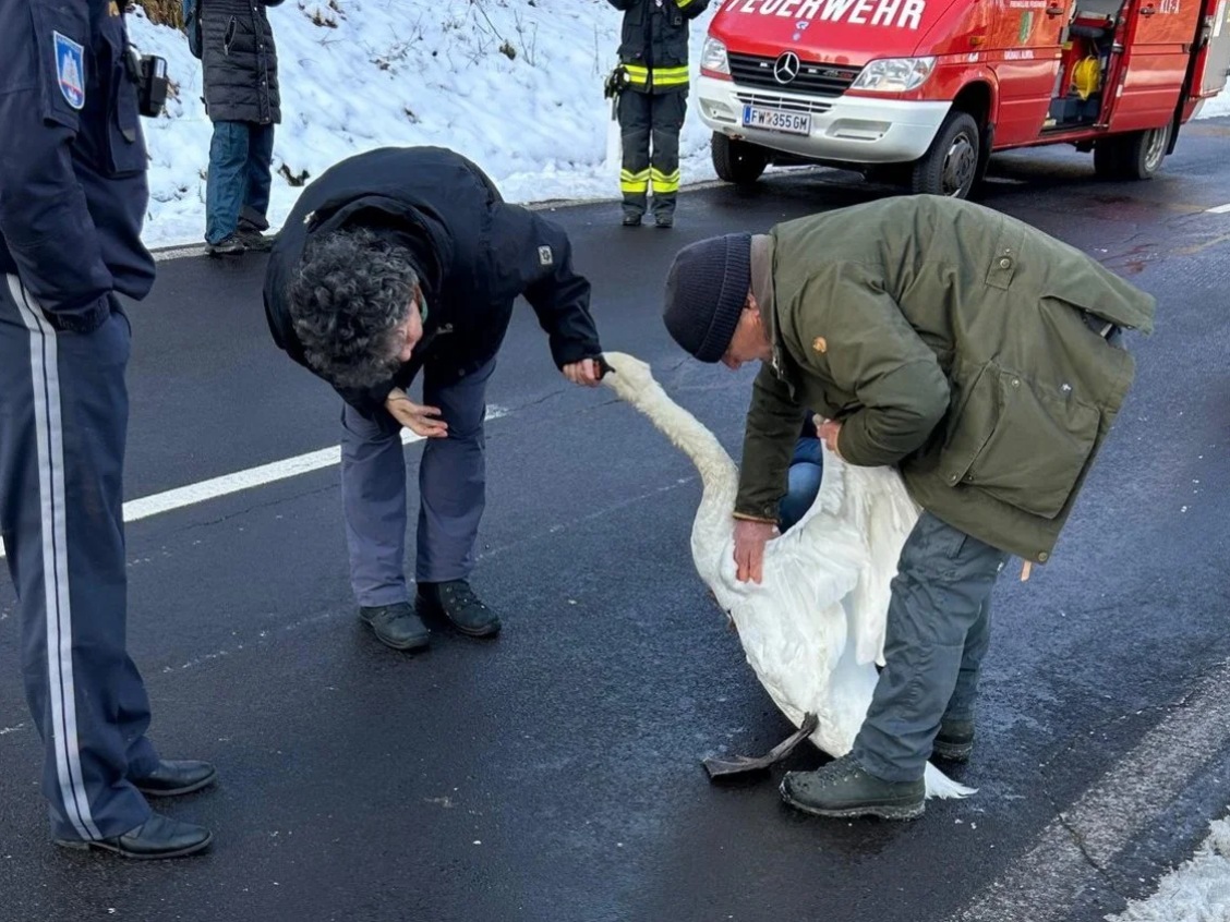 In Grünau im Almtal (Gmunden district), the volunteer fire department rescued a swan from the frozen Almsee on Sunday. During the night, the area around the bird had completely frozen over. "The animal was not frozen solid, but it could not free itself due to the slippery ice layer," informed the fire department.