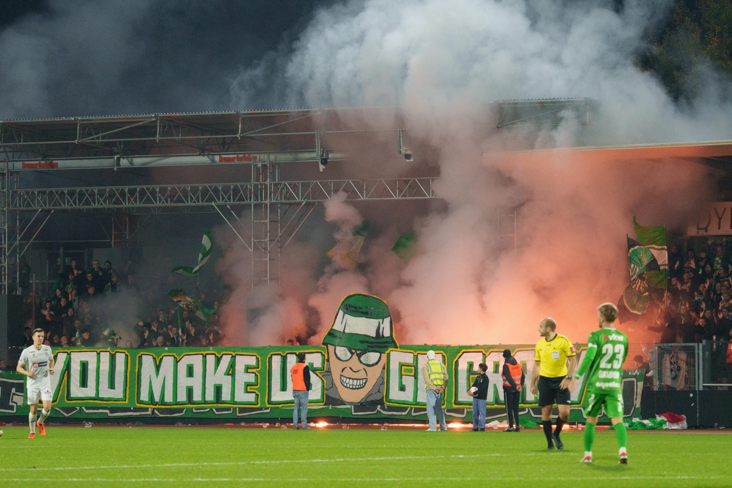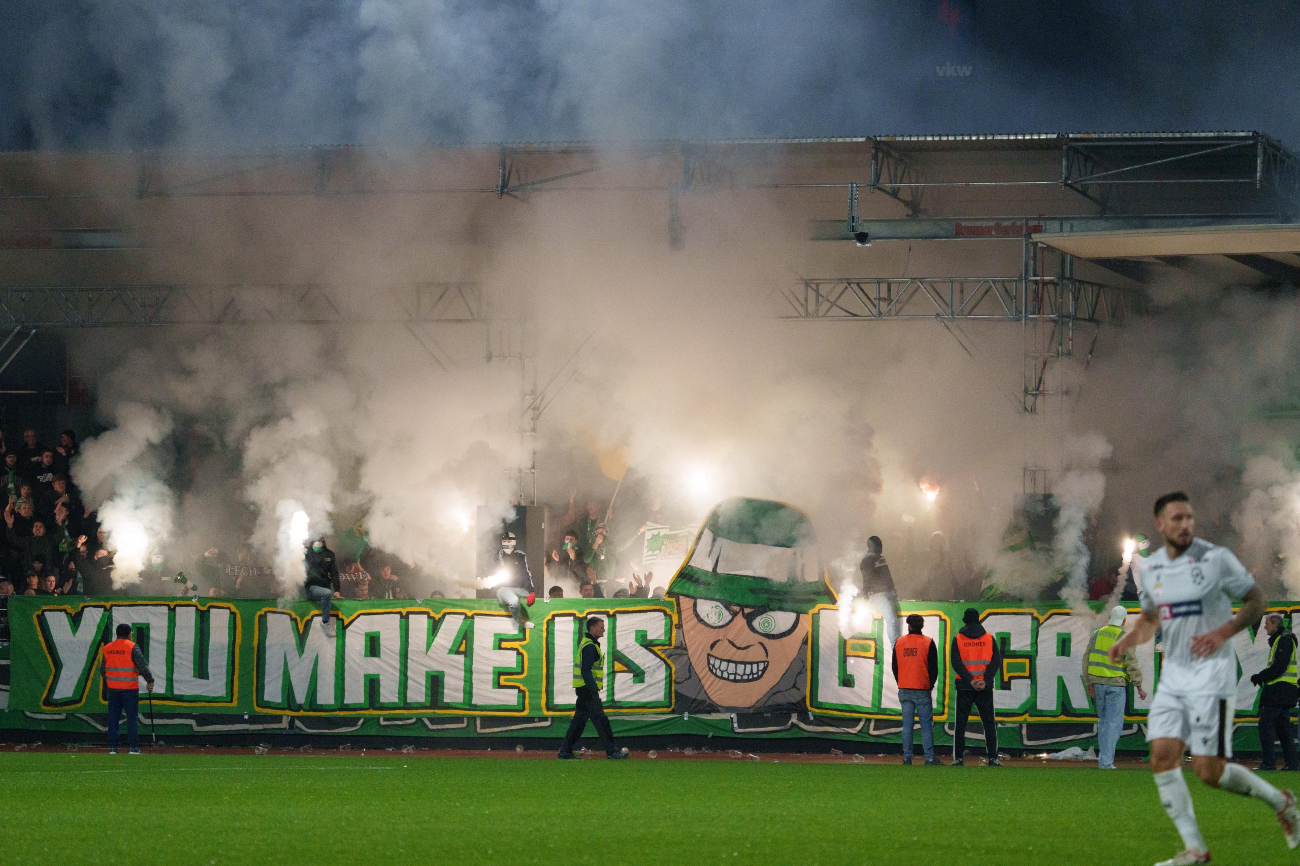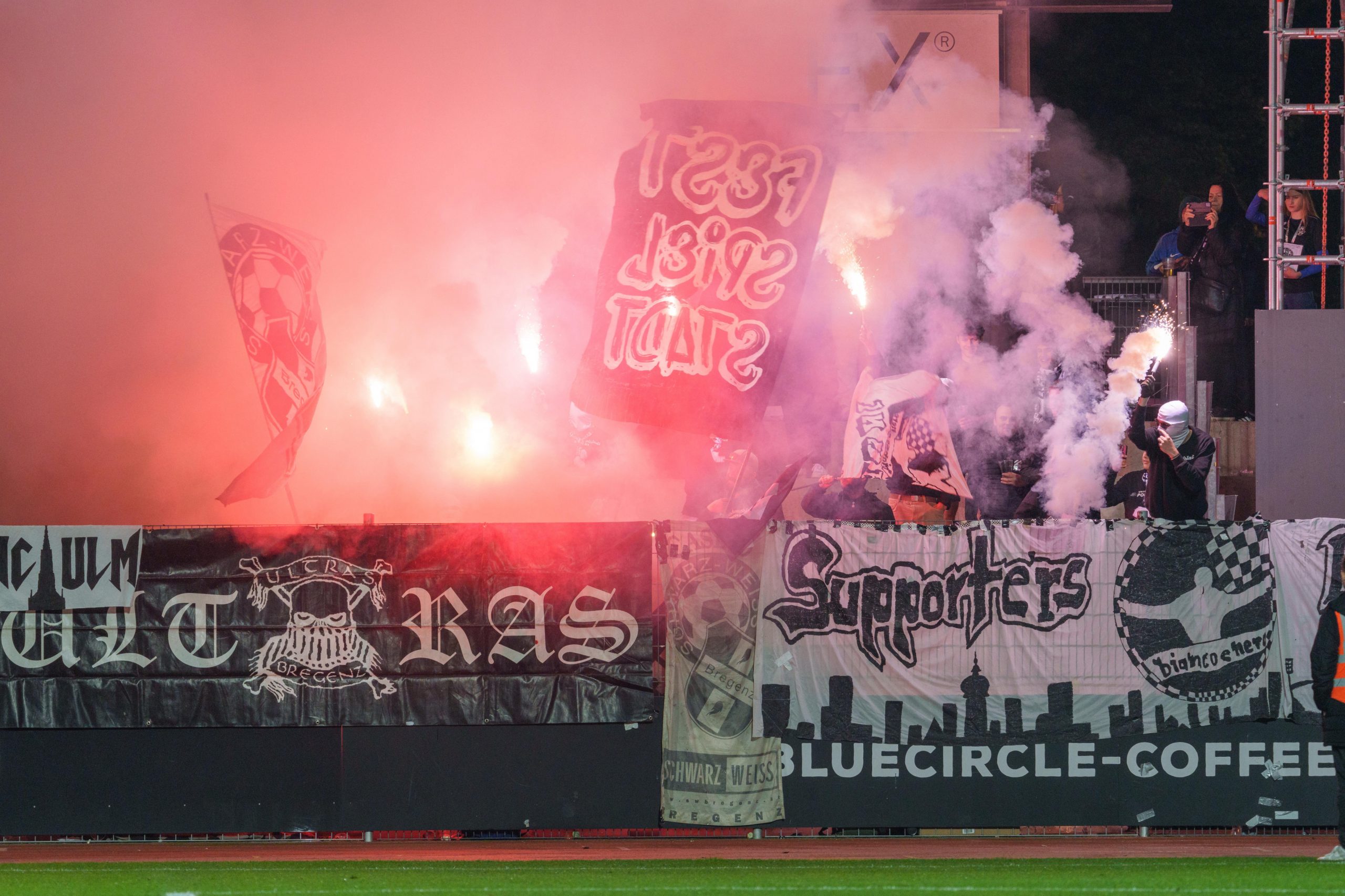 Obwohl SW Bregenz im eigenen Stadion spielt, ist Austria Lustenau offiziell Gastgeber. Deshalb müssen die Heimfans in den Gästesektor ausweichen.