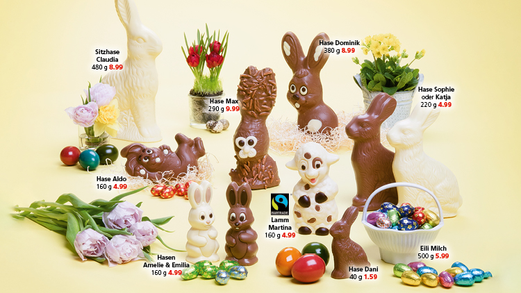 In einem perfekten Nest darf ein Osterhase aus Schokolade natürlich nicht fehlen: Ob Claudia, die sitzende Häsin aus weißer Schokolade, Dominik mit seinen weißen Flecken oder Aldo, der am liebsten auf dem Rücken liegt – bei Spar gibt es verschiedene Hasen aus feinster Schweizer Schokolade. Doch nicht nur Osterhasen finden sich im Sortiment wieder, auch das Lamm Martina sowie jede Menge gefüllte Schokoeier freuen sich auf einen Platz im Osternest.