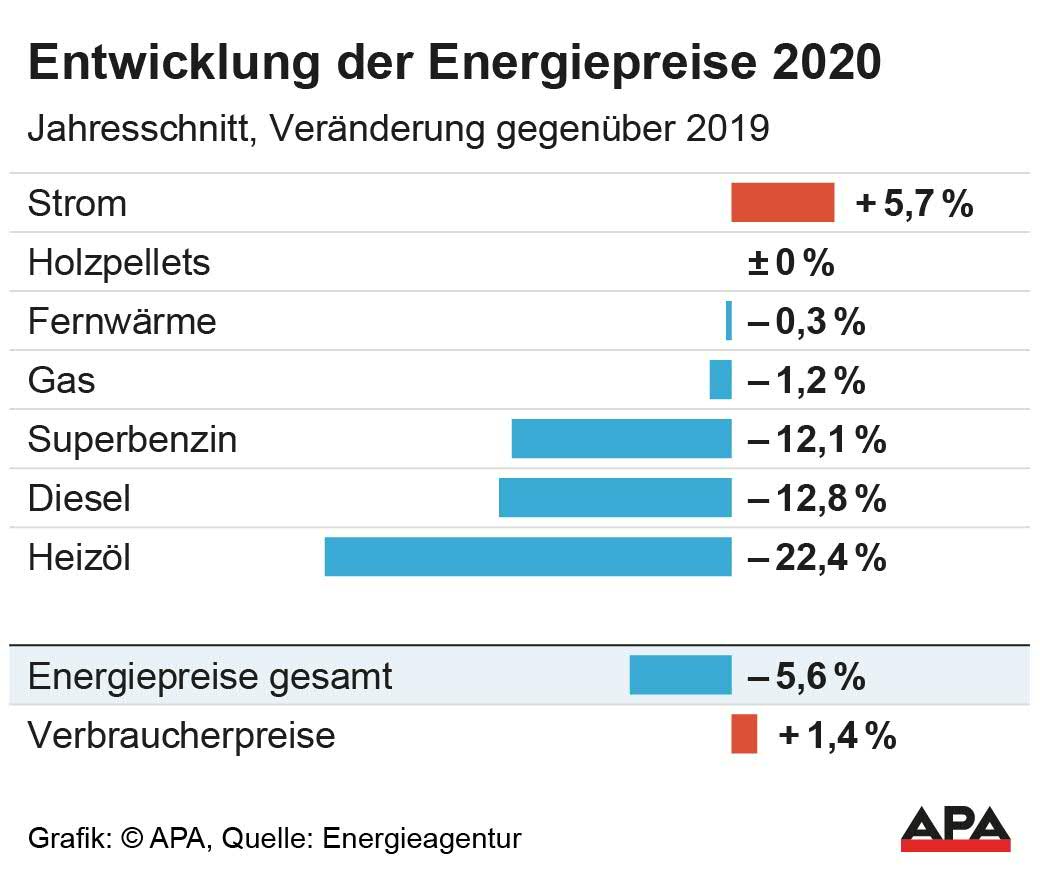 Den stärksten Preisrückgang gab es bei Heizöl mit minus 22,4 Prozent. Superbenzin kostete im Jahresdurchschnitt um 12,1 Prozent weniger. Diesel war um 12,8 Prozent billiger. Damit zahlte man für eine 50 Liter Tankfüllung 2020 unabhängig von der Treibstoffart um rund 6 Euro weniger als vor einem Jahr.