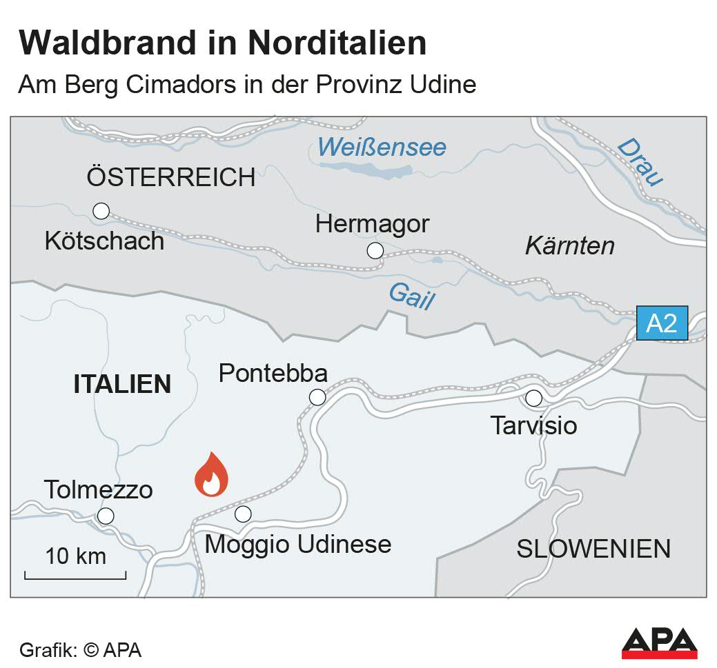 Das Feuer in Moggio Udinese auf dem Berg Cimadors in der italienischen Provinz Udine, das am 19. August ausgebrochen war, hat sich weiter ausgebreitet und eine enorme Dimension erreicht. Wie der Zivilschutz der norditalienischen Region Friaul Julisch Venetien mitteilte, beträgt die von den Flammen betroffene Fläche inzwischen 450 Hektar. Kärnten wurde bei der Brandbekämpfung um Unterstützung gebeten. Italienische Löschflugzeuge entnahmen Wasser aus dem Weißensee.