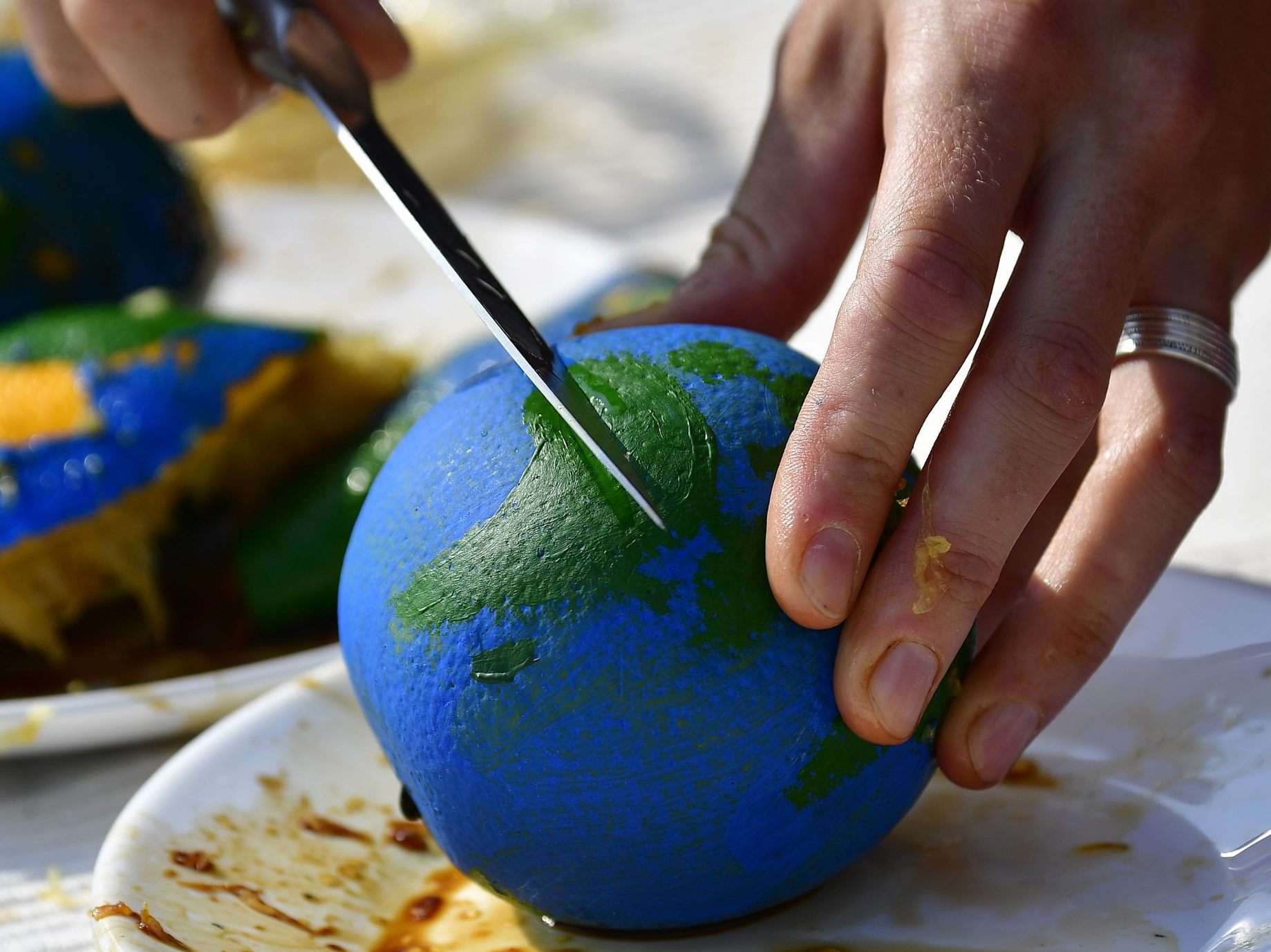 ©An environmental militant cuts an orange, painted as a globe, during an event to mark the Earth Overshoot Day on August 1, 2018 in Berlin. Earth Overshoot Day marks the date when we (all of humanity) have used more from nature than our planet can renew in the entire year. / AFP PHOTO / Tobias SCHWARZ