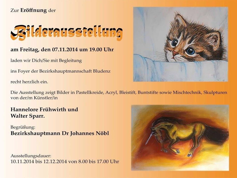 Im Rahmen dieser Ausstellung werden Skulpturen, Bilder in Pastellkreide, Acryl, Bleistift und Mischtechnik gezeigt. Die Ausstellung findet im Foyer der Bezirkshauptmannschaft Bludenz statt. Es lohnt sich diese Ausstellung zu besuchen, die dann ab 10.11. bis 12.12.2014 in der Zeit von 8 Uhr bis 17 Uhr geöffnet ist.