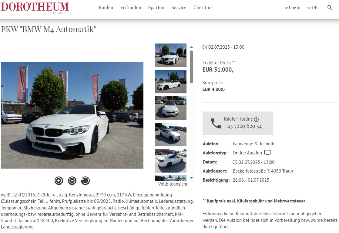 Den höchsten Zuschlag erzielte bislang ein BMW M4 mit 431 PS und Erstzulassung 2016, der im Juli 2025 um 31.000 Euro versteigert wurde. Der Wagen war laut Dorotheum "stark gebraucht, beschädigt" und "reparaturbedürftig". Beschlagnahmt wurde das Fahrzeug im September 2024, nachdem der Lenker auf der Vorarlberger Rheintalautobahn mit 210 km/h unterwegs war – erlaubt gewesen wären 110 km/h.