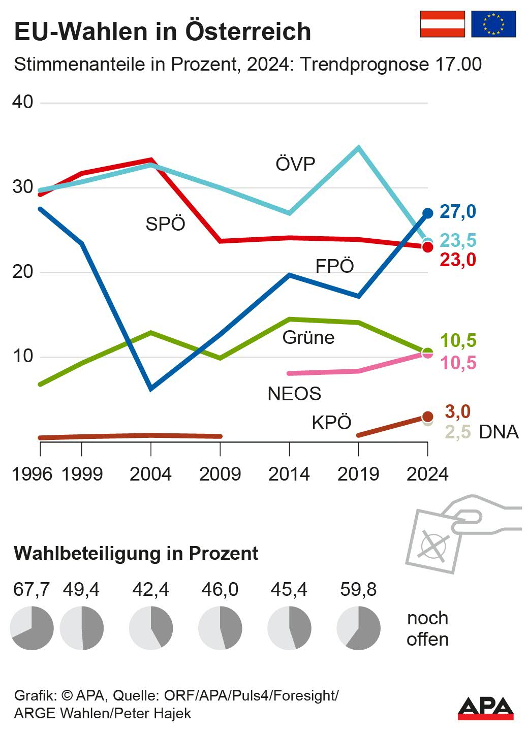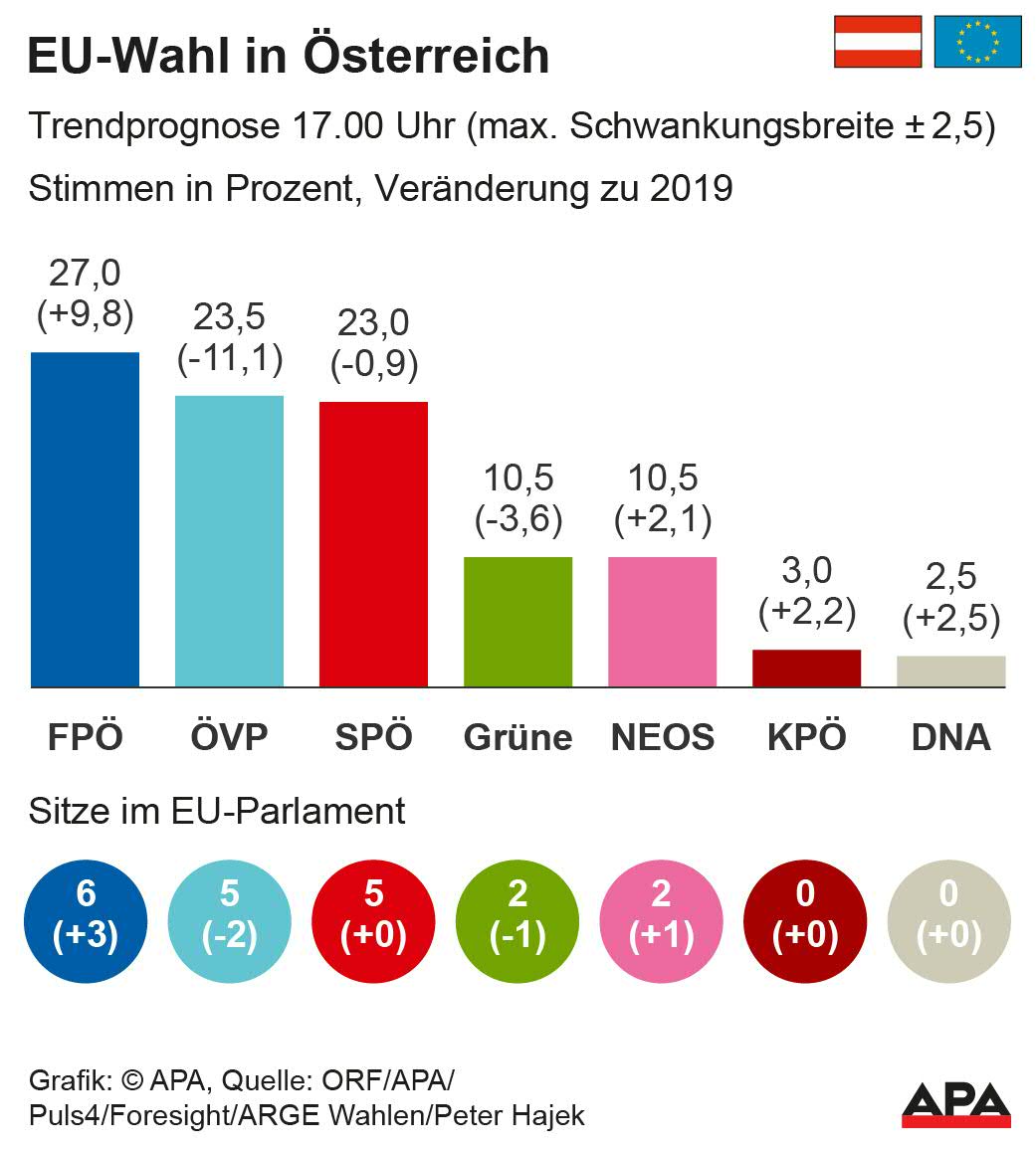 Auch bei den Mandaten hat die FPÖ laut der aktuellen Trendprognose die Nase voran: Mit künftig sechs Sitzen haben die Freiheitlichen um einen Abgeordneten mehr im Europaparlament als SPÖ und ÖVP, die jeweils auf fünf Mandate kommen. Die Grünen sowie die NEOS halten demnach künftig bei jeweils zwei Sitzen. Sollte die KPÖ doch noch den Sprung ins EU-Parlament schaffen, so hätte die FPÖ statt sechs Mandaten nur fünf Sitze.